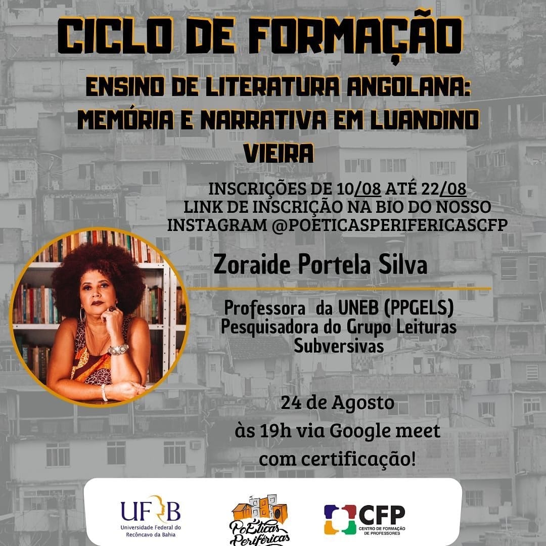 Neste mês trabalharemos com o tema " ENSINO DE LITERATURA ANGOLANA: memória e narrativa em Luandino Vieira com a professora e pesquisadora Zoraide Portela Silva. Faça sua inscrição e tenha um encontro marcado com a gente no dia 24/08, às 19h." O fim da guerra não é o fim da guerra!!!" (SILVA, 2020, p.95)