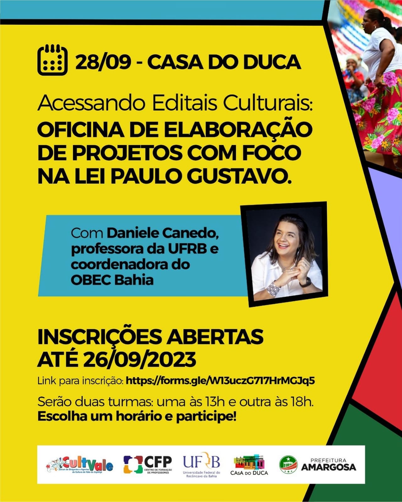 Em parceria com a Diretoria de Cultura do Município de Amargosa e a Representação Territorial de Cultura do Vale do Jiquiriçá (RTC/Secult-BA), o Centro de Formação de Professores oferece o curso de extensão “Acessando editais culturais”, a ser ministrado pela Prof.ª Dr.ª Daniele Pereira Canedo (CECULT/UFRB). O objetivo da proposta é qualificar e capacitar trabalhadores e produtores da área da cultura para a interpretação das leis de incentivo disponíveis no país, bem como apresentar, de modo resumido, os passos referentes ao planejamento, escrita e desenvolvimento de projetos culturais (produção textual, orçamentária, formatação, enquadramento, gestão) a serem submetidos aos editais nacionais. A proposta tem como público alvo os agentes e trabalhadores da cultura e possíveis multiplicadores locais dos municípios de Amargosa, Mutuípe e regiões vizinhas.