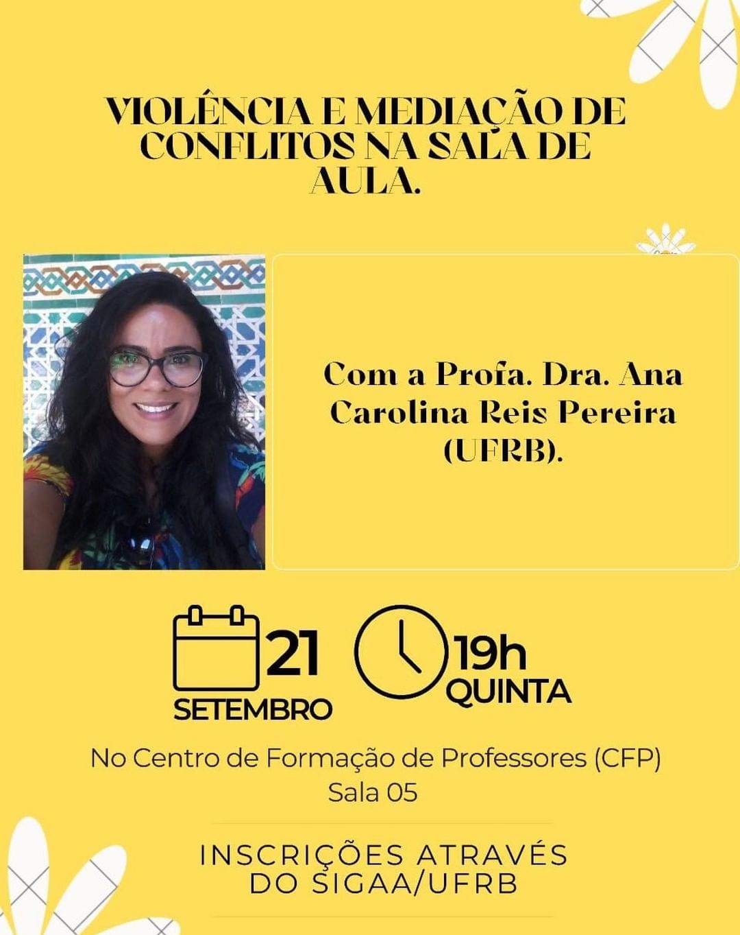 Evento com a Profa. Ana Carolina Reis Pereira (Filosofia UFRB/NUPEF).Esse evento cumpre a carga horária da curricularização da extensão e é aberto à comunidade. Nele, vamos abordar questões relativas aos direitos humanos, inscritas na BNCC e nas DCRB, como temas que devem ser trabalhados de modo transversal nas respectivas disciplinas e áreas do conhecimento. A ideia é abordar um conjunto de temas em formato de oficinas, de modo que subsidiem a reflexão sobre a sua inserção na prática pedagógica docente.
