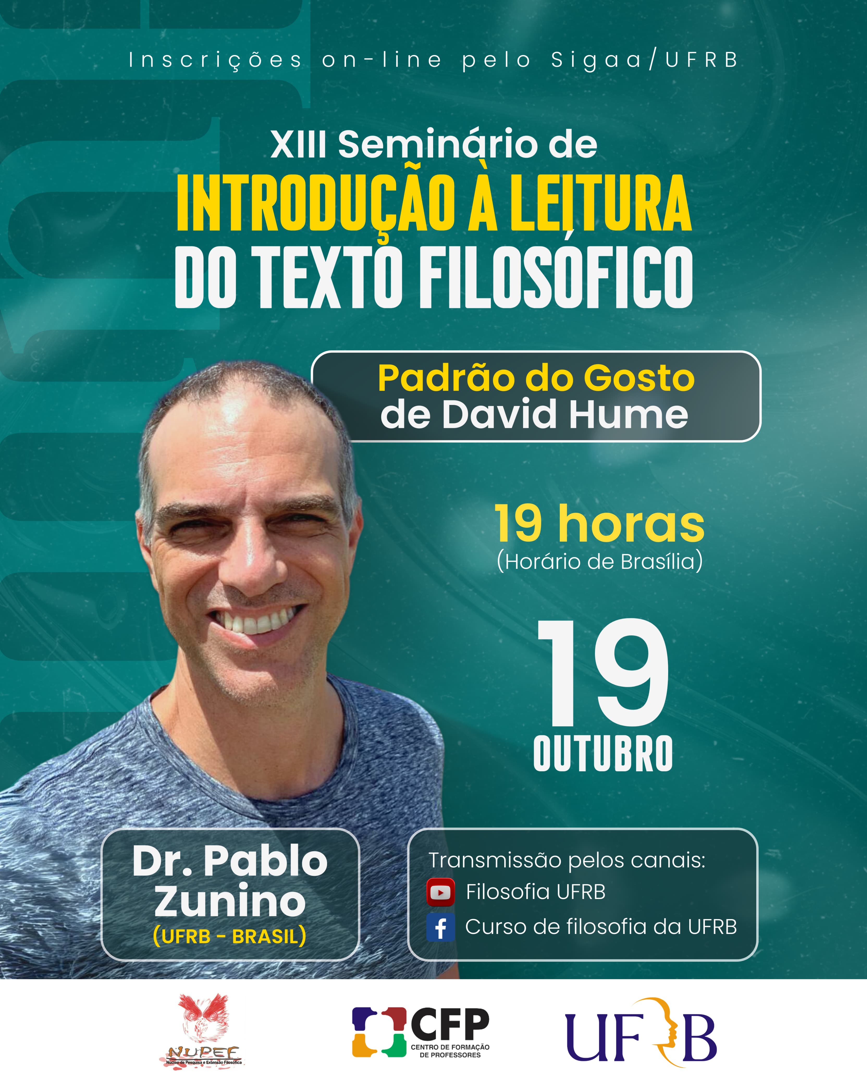 O XIII Seminário de Introdução ao Ensino de Filosofia é uma ação do NUPEF/UFRB em parceria com os estudantes do componente curricular Introdução à Filosofia e seu Ensino e coordenado pelo Prof. Ricardo Andrade. Nesta edição o Seminário receberá o Prof. Dr. Pablo Zunino (NUPEF/UFRB) que falará sobre o texto Padão do Gosto, de David Hume. O evento será transmitido pelas redes sociais do NUPEF no Youtube e no Facebook.