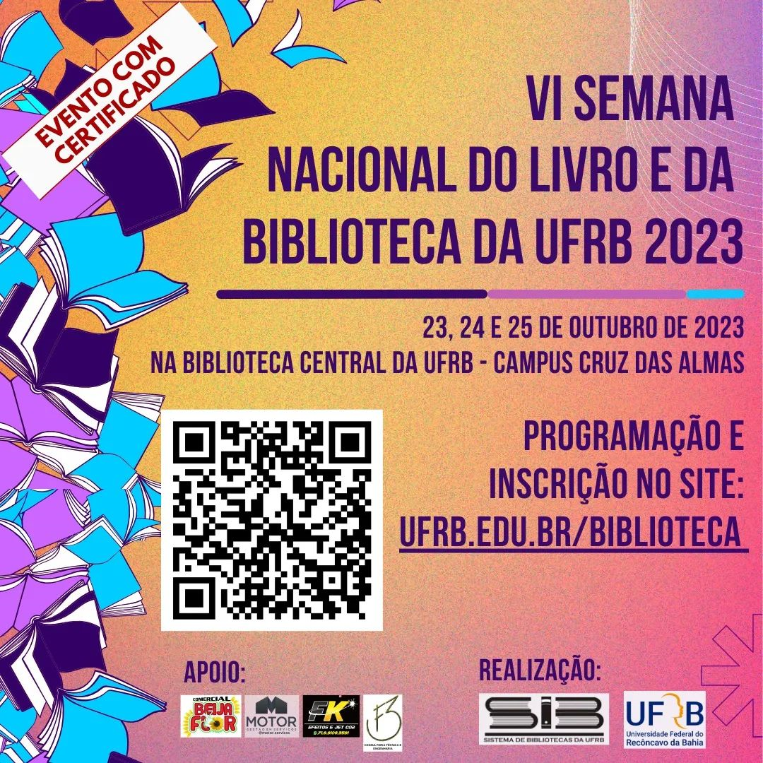 O Sistema de Bibliotecas (SIB) da UFRB convida a Comunidade para participar da VI Semana Nacional do Livro e da Biblioteca, que ocorrerá nos dias 23, 24 e 25 de outubro. Com o objetivo de enaltecer a importância da leitura, propagar a cultura e estimular o conhecimento ao difundir o livro e a biblioteca, através da democratização do saber.
