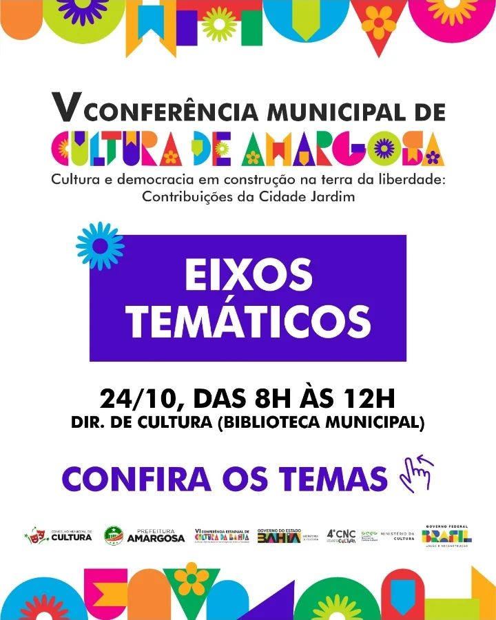 Acontece no dia 24 de outubro,das 8 às 12h, na Biblioteca Municipal, a V Conferência Municipal de Cultura de Amargosa, com o tema Cultura e democracia em construção na terra da liberdade: Contribuições da Cidade Jardim.