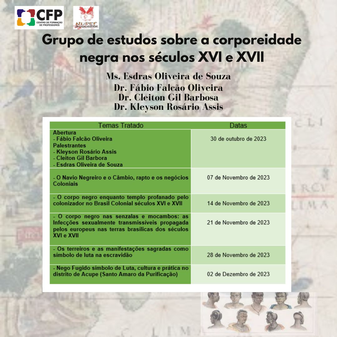 O Grupo de estudos sobre a corporeidade negra nos séculos XVI e XVII (GECON) se formou na possibilidade de pensarmos as questões afrobrasileiras a partir do século XVI e XVII. Para isso, destacamos que houve a necessidade de apresentar as atividades com formato de encontros semanais, dado pela carga horária destacada. A temática do grupo tem como finalidade levantar as questões de racismo, reacionarismo, extremismo e também, pensarmos como o corpo dos seres humanos (negras e negros) eram abusados, acorrentados e maltratados pelos colonizadores. Construindo assim, uma prática reflexiva que demanda celeridade na leitura.