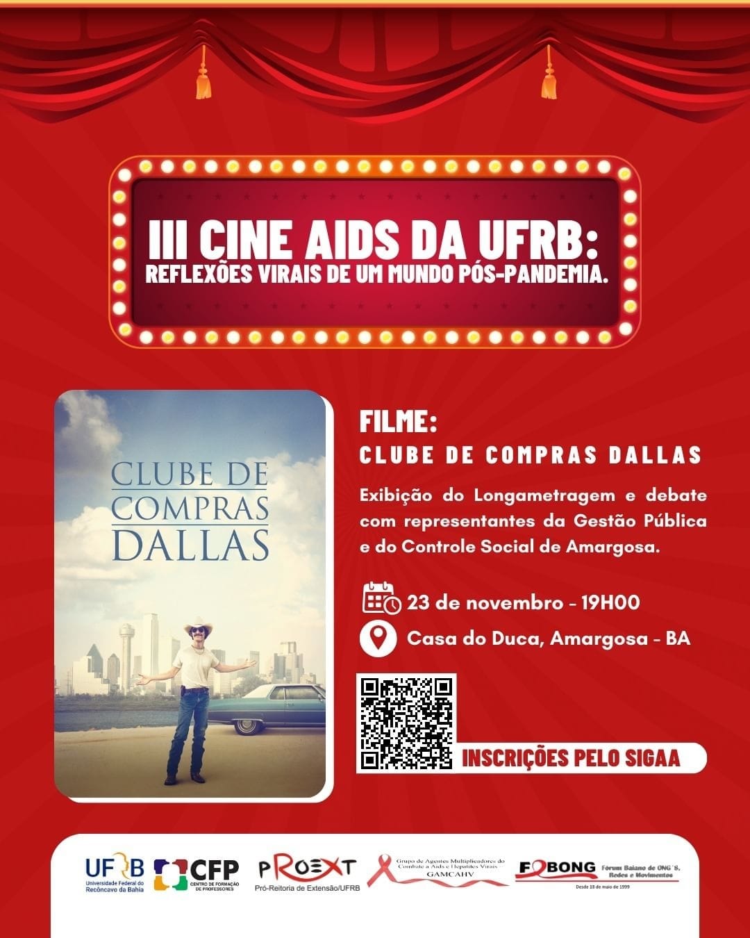 O III Cine Aids da UFRB será uma exibição de um longa metragem. Após exibir o filme, abriremos para roda de conversa com diversos convidados, tais como representantes de conselhos de educação, saúde, juventude, assistência social. Também contamos com a participação de gestores escolares, professores e demais seguimentos que representem a sociedade no âmbito da sociedade civil organizada e setor público tal como associações, grupos sociais, e secretarias do município. Considerando a expansão dos casos das Infecções Sexualmente Transmissíveis (IST) no cenário nacional, foi registrado na Bahia 14.392 casos da infecção pelo vírus do HIV entre 2016 e 2021. Dentre este, 1.609 casos foram notificados em 2021, segundo o Boletim Epidemiológico do Departamento Nacional de IST/AIDS e Hepatites Virais do Ministério da Saúde (MS). Em Amargosa – BA, o Serviço de Atenção Especializado (SAE), só em 2023 registrou o total de 13 (treze) casos, sendo 10 (dez) de HIV, 00 (zero) de Hepatite B; 01 (um) de Hepatite C, 00 (zero) de crianças expostas com o HIV mediante a transmissão vertical (transmitida na gravidez da mãe para o feto), 02 (dois) de HTLV. Com base na estimativa populacional de Amargosa (2022), segundo o Instituto Brasileiro de Geografia e Estatísticas (IBGE) é de 36.522 mil habitantes, o que em face dos números de pessoas infectadas pelo vírus do HIV de 10 casos, representa uma prevalência de 003,65% a cada mil habitantes. Unir esforços entre educação, saúde e sociedade civil organizada e população em geral se faz necessário diante do cenário apresentado pelo SAE Amargosa, há a necessidade de ações efetivas da promoção a saúde na perspectiva das IST/AIDS, HV e HTLV, no âmbito educativo. É neste contexto que o “III Cine AIDS da UFRB – Reflexões Virais de um mundo Pós-Pandemia”, se configura, enquanto um momento de reflexão sobre as muitas vidas interrompidas por essa síndrome, pois muitos heróis morreram defendendo a necessidade de promover políticas públicas voltadas aos direitos humanos e justiça social no âmbito da Integralidade, equidade, universalidade e, sobretudo, controle social.