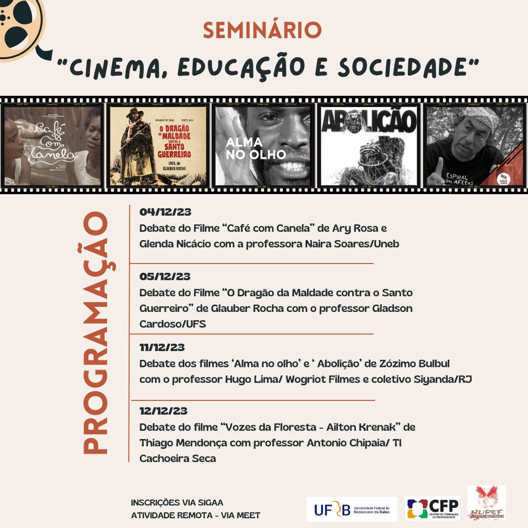 04/12 - Debate do Filme “Café com Canela” de Ary Rosa e Glenda Nicácio com a professora Naira Soares/Uneb05/12 - Debate do Filme “O Dragão da Maldade contra o Santo Guerreiro” de Glauber Rocha com o professor Gladson Cardoso/UFS11 /12 - Debate dos filmes ‘Alma no olho’ e ‘ Abolição’ de Zózimo Bulbul com o professor Hugo Lima/CEFET/RJ12/12/ 2023 - Debate do filme “Vozes da Floresta - Ailton Krenak” de Thiago Mendonça com professor Antonio Chipaia