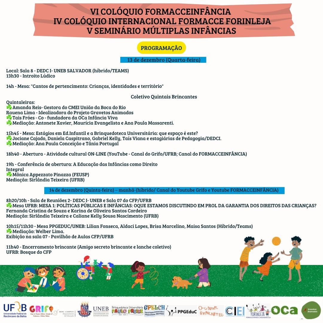 As atividades acontecerão no formato híbrido e as inscrições serão realizadas no período de 05 a 13 de dezembro, gratuitamente, pelo SIGAA (https://sistemas.ufrb.edu.br/sigaa/public/home.jsf). O evento tem como objetivo abordar as temáticas emergentes sobre as infâncias no campo da Pedagogia, sobretudo, o debate relacionado ao direito à educação, a fim de discutir e construir formas de se relacionar e construir os diálogos sobre educação, currículo e culturas infantis, a partir da reflexão acerca da realidade das múltiplas infâncias existentes na realidade escolar, social e cultural.
