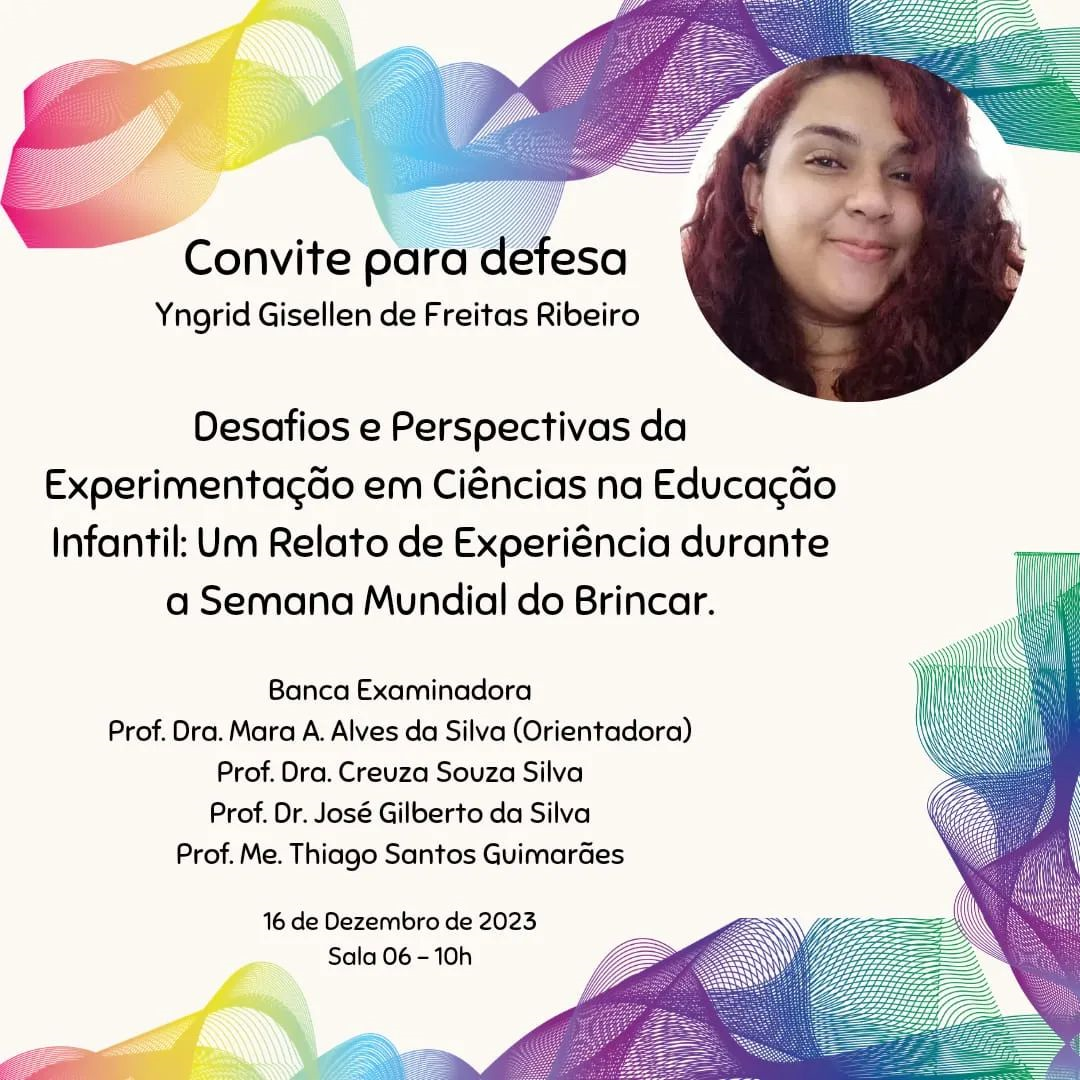 Convidamos para a Defesa Pública de Trabalho de Conclusão de Curso da discente Yngrid Gisellen de Freitas Ribeiro do Curso de Licenciatura em Química do Centro de Formação de Professores (CFP) da Universidade Federal do Recôncavo da Bahia (UFRB).Data: 16/12/2023Horário: 10hLocal: CFP/UFRB, Pavilhão de Aulas, Sala 06Título- Desafios e Perspectivas da Experimentação em Ciências na Educação Infantil: Um Relato de Experiência durante a Semana Mundial do Brincar