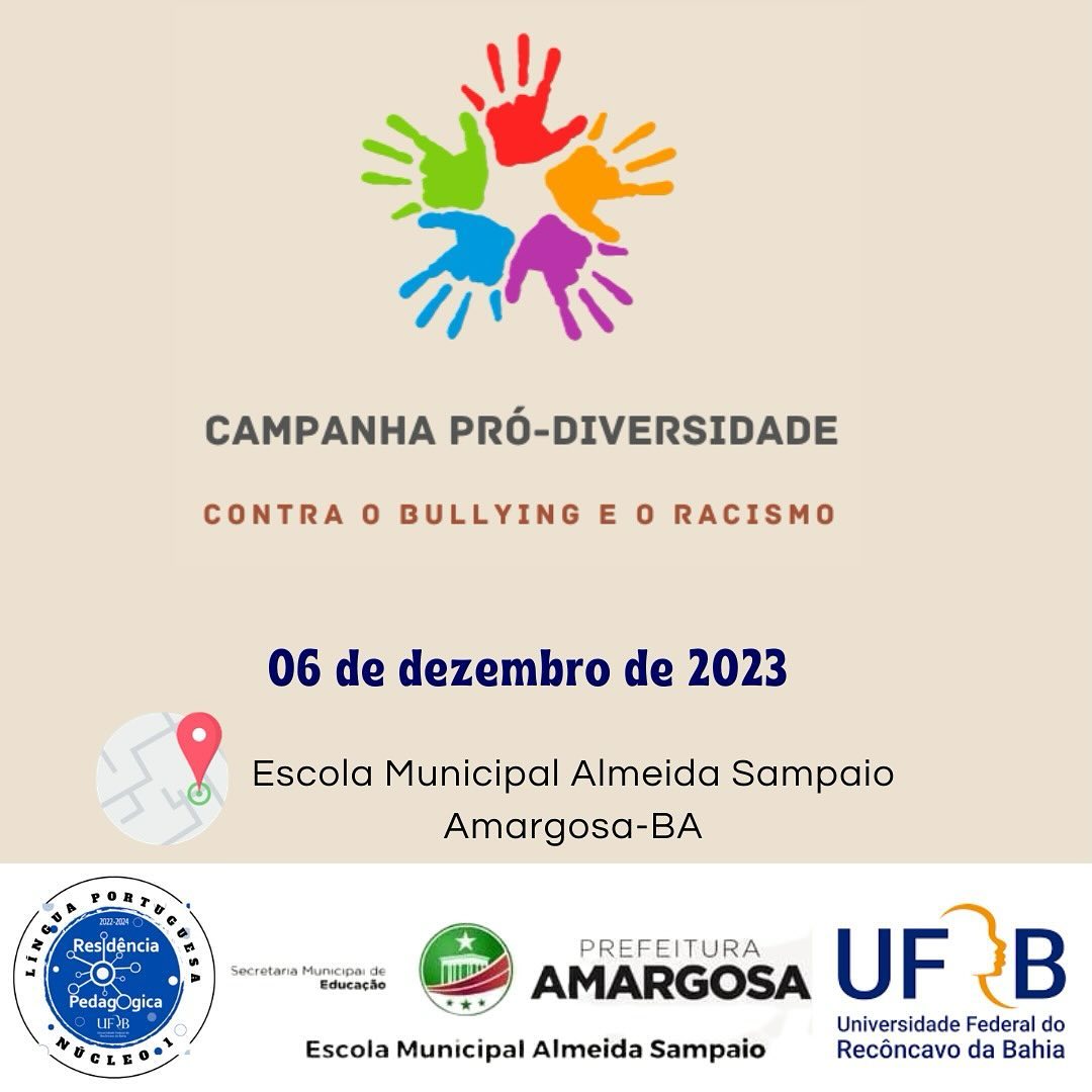 No dia 06 de dezembro, o Núcleo 1 do subprojeto de Língua portuguesa do Programa Residência Pedagógica da UFRB, em pareceria com a Escola Municipal Almeida Sampaio (Amargosa/BA), realizará uma mostra de atividades produzidas em um projeto de letramento, que teve como finalidade fazer uma campanha pró - diversidade e contra o racismo e o bullying.