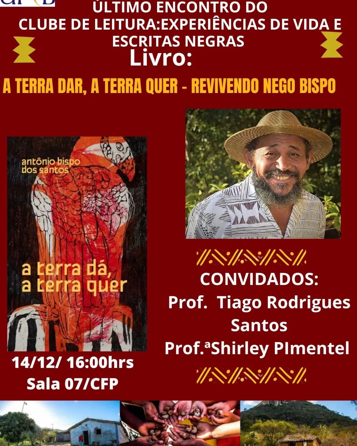 O Clube de Leitura: Experiências de Vida Leituras e escritas Negras juntamente com a organização do IV Seminário Educação e Escolas Quilombolas realizarão uma homenagem ao escritor, pensador, professor e ativista social Antônio Bispo dos Santos, conhecido como Nêgo Bispo, que nos deixou no dia 03 de dezembro. Referenciando o legado de um dos maiores intelectuais quilombolas desse país o Clube de Leitura e o EEtnografar, juntamente com o coletivo da Educação Quilombola da UFRB, convida a todxs para a o encontro: *A Terra dar, a Terra quer – Revivendo Nego Bispo*.Data: 14 de dezembro de 2023.Horário:16:00Local: Centro de Formação de Professores, sala 06