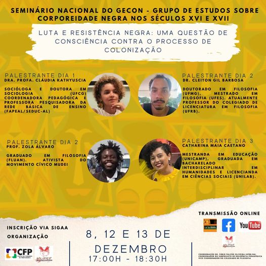O Grupo de Estudos sobre a Corporeidade Negra nos Séculos XVI e XVII (GECON) se formou na possibilidade de pensarmos as questões afrobrasileiras a partir do século XVI e XVII. Para isso, destacamos que houve a necessidade de apresentar as atividades com formato de encontros semanais, dado pela carga horária destacada. A temática do Grupo tem como finalidade levantar as questões de racismo, reacionarismo, extremismo e também, pensarmos como o corpo dos seres humanos (negras e negros) eram abusados, acorrentados e maltratados pelos colonizadores. Construindo, assim, uma prática reflexiva que demanda celeridade na leitura.