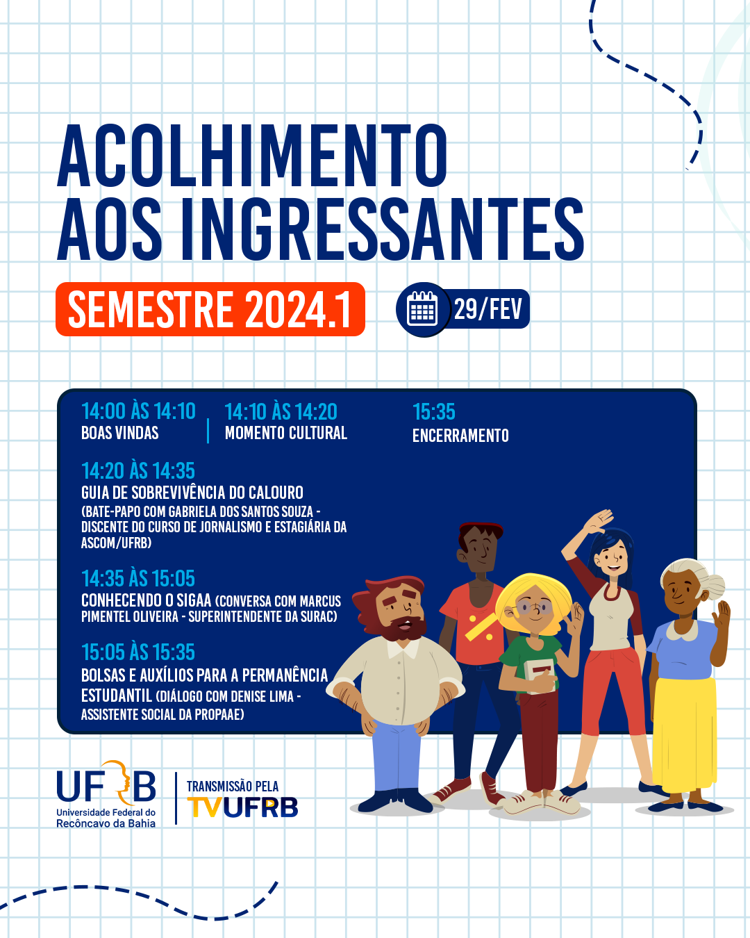 14:20 - 14:35 Guia de Sobrevivência do Calouro (Bate-papo com Gabriela dos Santos Souza - Discente do curso de Comunicação Social e estagiária da ASCOM/UFRB)