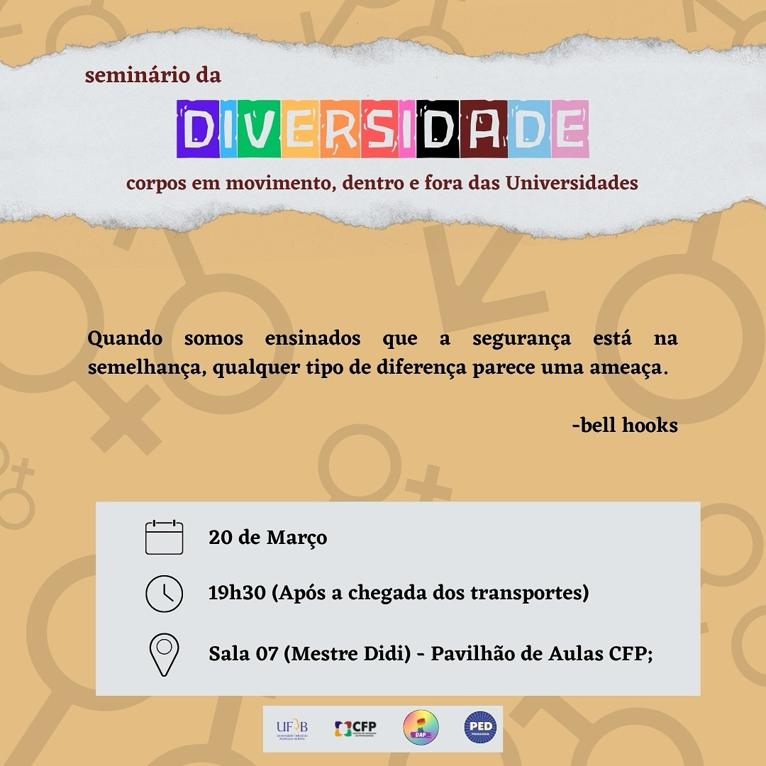 A proposta do Seminário surge, quando o Diretório Acadêmico de Pedagogia, hoje composto apenas por três estudantes de semestralização diferentes, veem a necessidade de falarmos sobre tudo aquilo que nos afeta (Sexualidade; Gênero; Racismo; Mães Universitárias...) e que nos incomoda... podendo abrir espaços para diálogos que serão discutidos por estudantes, neste seminário organizados pelos mesmos e destinado para todos do corpo universitário (Desde colaboradores a estudantes de graduação). O objetivo deste seminário é falar sobre a Diversidade no Ensino e todos os temas, que por falta de discussão ou medo (Tabu), possam ser verbalizados por estudantes da Universidade Federal do Recôncavo da Bahia e convidados. Com isso, pensamos em colaborar para um ambiente acadêmico envolvido com o compromisso ético e político o qual preza pela diversidade, desmistificando as formas hegemônicas de existência e caminhando contra as desigualdades, deste modo ressaltamos a importância de uma Universidade Pública diversa que fala das histórias silenciadas, contribuindo no desenvolvimento do ambiente acadêmico e com toda certeza com a construção da criticidade dos estudantes recém chegados e veteranos