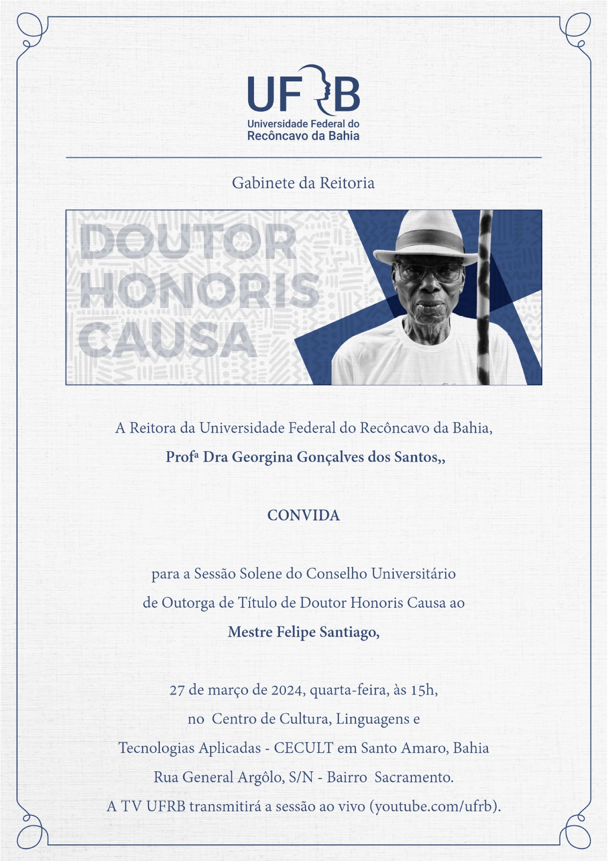O mestre de capoeira Felipe Santiago, 96 anos, receberá o título de Doutor Honoris Causa, concedido pelo Conselho Universitário (CONSUNI) da Universidade Federal do Recôncavo da Bahia (UFRB), em sessão solene marcada para o dia 27 de março, às 15h, no Centro de Cultura, Linguagens e Tecnologias Aplicadas (CECULT), Campus Santo Amaro. O evento será transmitido pela TV UFRB.