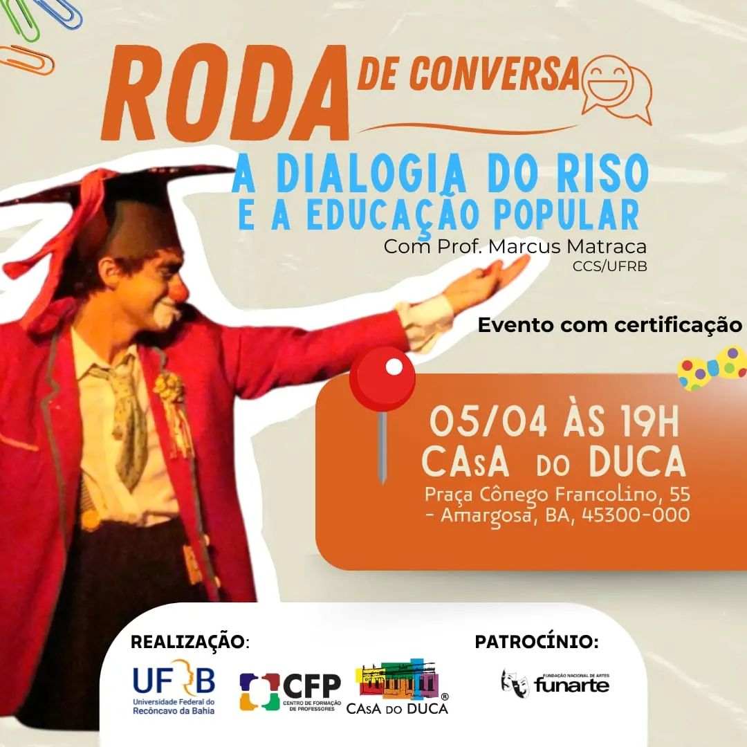 Roda de conversa "A Dialogia do Riso e a Educação Popular" com o Professor Marcus Vinicius Campos (Marcus Matraca) no dia 05 de abril às 19h na CAsA do DUCA. A roda de conversa “A Dialogia do Riso e a Educação Popular" visa discutir a perspectiva do palhaço, figura que, dentre muitas coisas, é um mediador da Dialogia do Riso, um conceito baseado na prática da educação popular em saúde, desenvolvida com alegria. Marcus Matraca entende a promoção da saúde como uma reação positiva que leva a uma percepção ampliada, integrada, complexa e Inter setorial: articula ambiente, educação, arte, pessoas, estilo e qualidade de vida.Quem é Marcus Matraca?Marcus Vinicius Campos @marcusmatraca , também conhecido como Marcus Matraca, nome que adotou desde 2005 para assinar suas produções científicas e artísticas. Marcus Matraca é docente no Centro de Ciências da Saúde (CCS) da UFRB e atualmente coordena o Laboratório Ateliê de Educação Popular em Saúde (LAEPS).Matraca é Bacharel em Ciências Sociais (UNESP), Mestre em Saúde Coletiva (UNICAMP), Doutor em Ciência e Arte (EBS/IOC), Pós Doutor em Ensino de Ciências (EBS/ IOC), Educador Popular, Músico, Palhaço, Artista e Ciclista.Duração: 2hPúblico: AdultoLocal: CAsA do DUCACom emissão de Certificado!E aí, vamos participar da Roda de Conversa? Estamos aguardando vocês na @casadoduca
