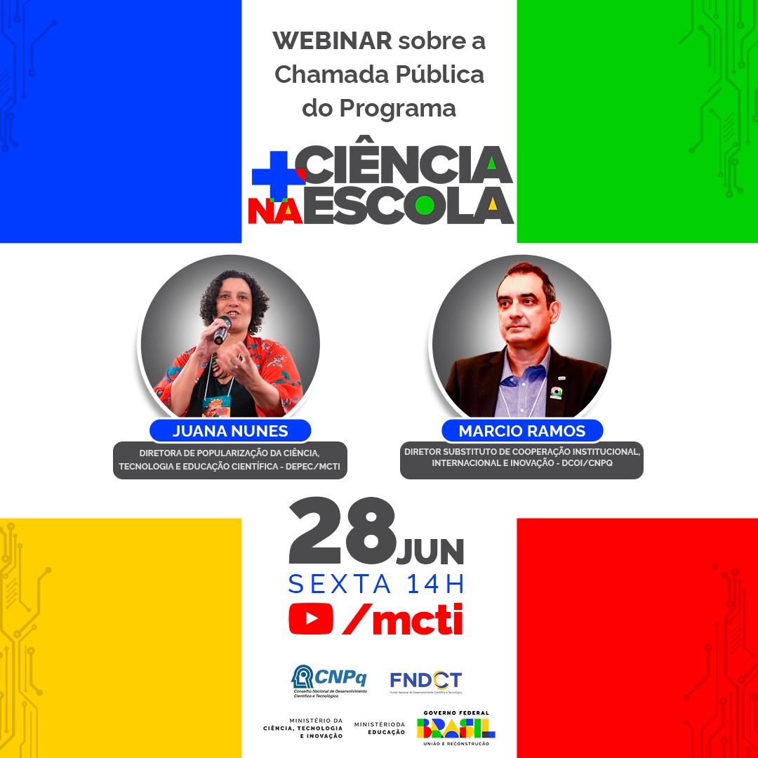 Participações: Juana Nunes - Diretora de Popularização da Ciência, Tecnologia e Educação Científica (DEPEC/MCTI) Anita Gea Martinez - Diretora De Apoio à Gestão Educacional (DAGE/MEC) Marcio Ramos - Diretor Substituto de Cooperação Institucional Internacional de Inovação (DCOI/CNPQ)