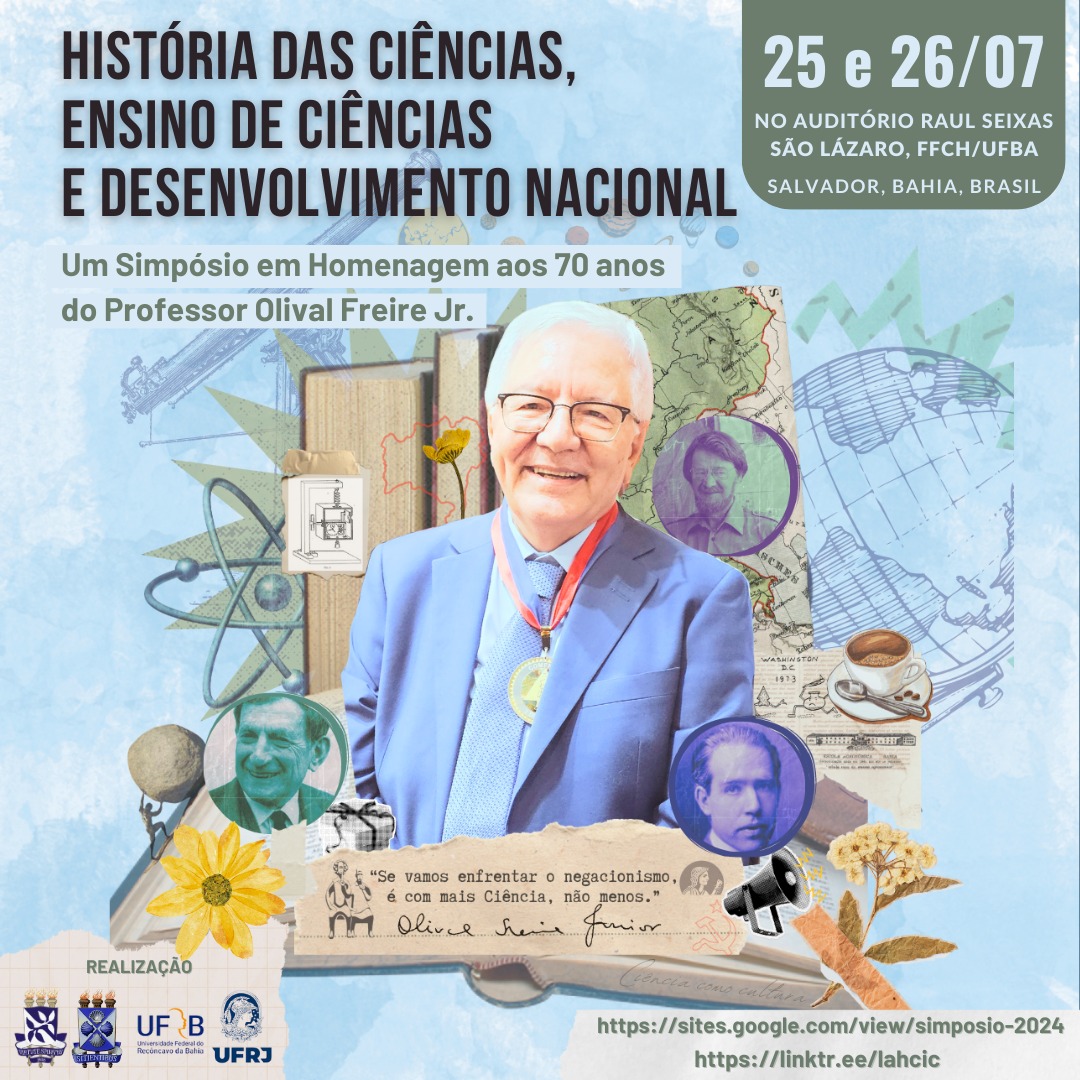 Nos dias 25 e 26 de julho de 2024, ocorrerá no auditório da Faculdade de Filosofia e Ciências Humanas da Universidade Federal da Bahia o simpósio “História das Ciências, Ensino de Ciências e Desenvolvimento Nacional” em homenagem aos 70 anos do professor Olival Freire Jr., professor titular do Instituto de Física da Universidade Federal da Bahia e Diretor Científico do CNPq.