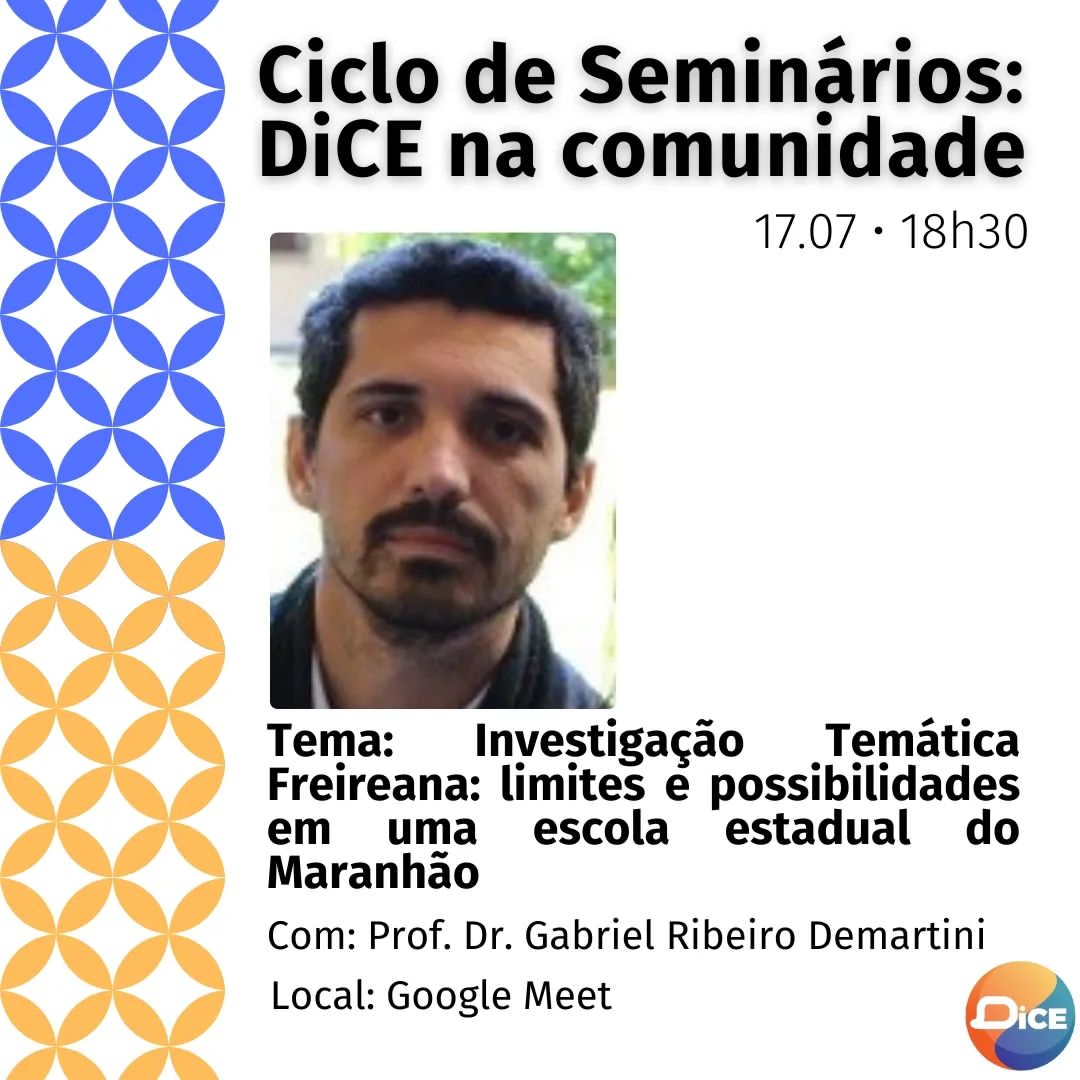 Em continuidade ao "Ciclo de Seminários: DiCE na comunidade", para a nossa 2ª palestra contamos com a presença do Prof. Dr Gabriel Ribeiro Demartini palestrando sobre o tema: "Investigação Temática Freireana: limites e possibilidades em uma escola estadual do Maranhão".Gabriel Ribeiro Demartini é Doutor em Educação pelo Programa de Pós Graduação em Educação (PPGEd) da Universidade Federal de São Carlos (UFSCar), na linha de pesquisa Teorias e Fundamentos da Educação e Mestre em Educação pela Universidade Federal de São Carlos (UFSCar). É Licenciado em Ciências Biológicas pela Universidade Federal de São Carlos (UFSCar) e em Pedagogia pelo Centro Universitário Internacional UNINTER. Como área de pesquisa, investiga processos de construção curricular no ensino de Ciências e Biologia a partir dos pressupostos da pedagogia crítica.A palestra acontecerá de forma remota através da plataforma virtual Google Meet, e o link será disponibilizado para os ouvintes inscritos no link abaixo, no dia da palestra.Inscreva-se, estamos esperando por vocês! Link de inscrição na bio:https://sistemas.ufrb.edu.br/sigaa/link/public/extensao/visualizacaoAcaoExtensao/91799335