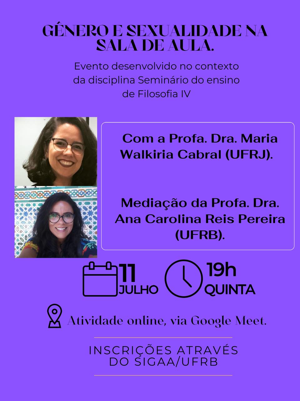 Na palestra do dia 11/07 debateremos sobre "Gênero e sexualidade na sala de aula", com a profa. Dra. Maria Walkiria Cabral (UFRJ). Atividade online, com início às 19h. O link será enviado no dia do evento.