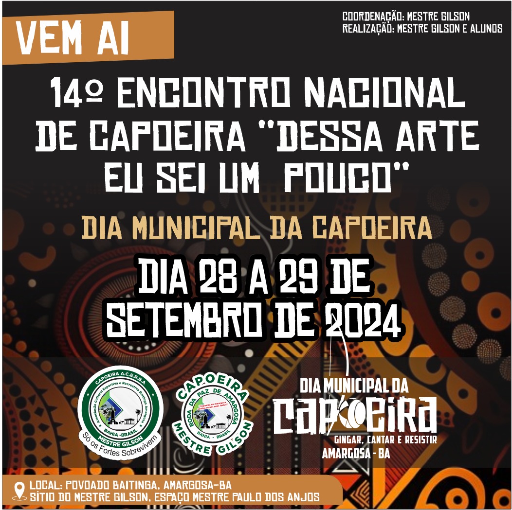 O 14º Encontro Nacional de Capoeira "Dessa Arte Eu sei um Pouco" é um evento que acontece anualmente, e que se reune varios capoeiristas, de variados lugares do pais, para a realiação de intercâmbio cultural, com a realização de oficinas, jogo de capoeira, troca de saberes além de vivenciar muita capoeira. Este evento é realizado durante dois dias consecutivos sendo no sabado (28/09/2024) e no domingo (29/09/2024), sendo que no domingo é comemorado o Dia Municipal da Capoeira no municipio de Amargosa .