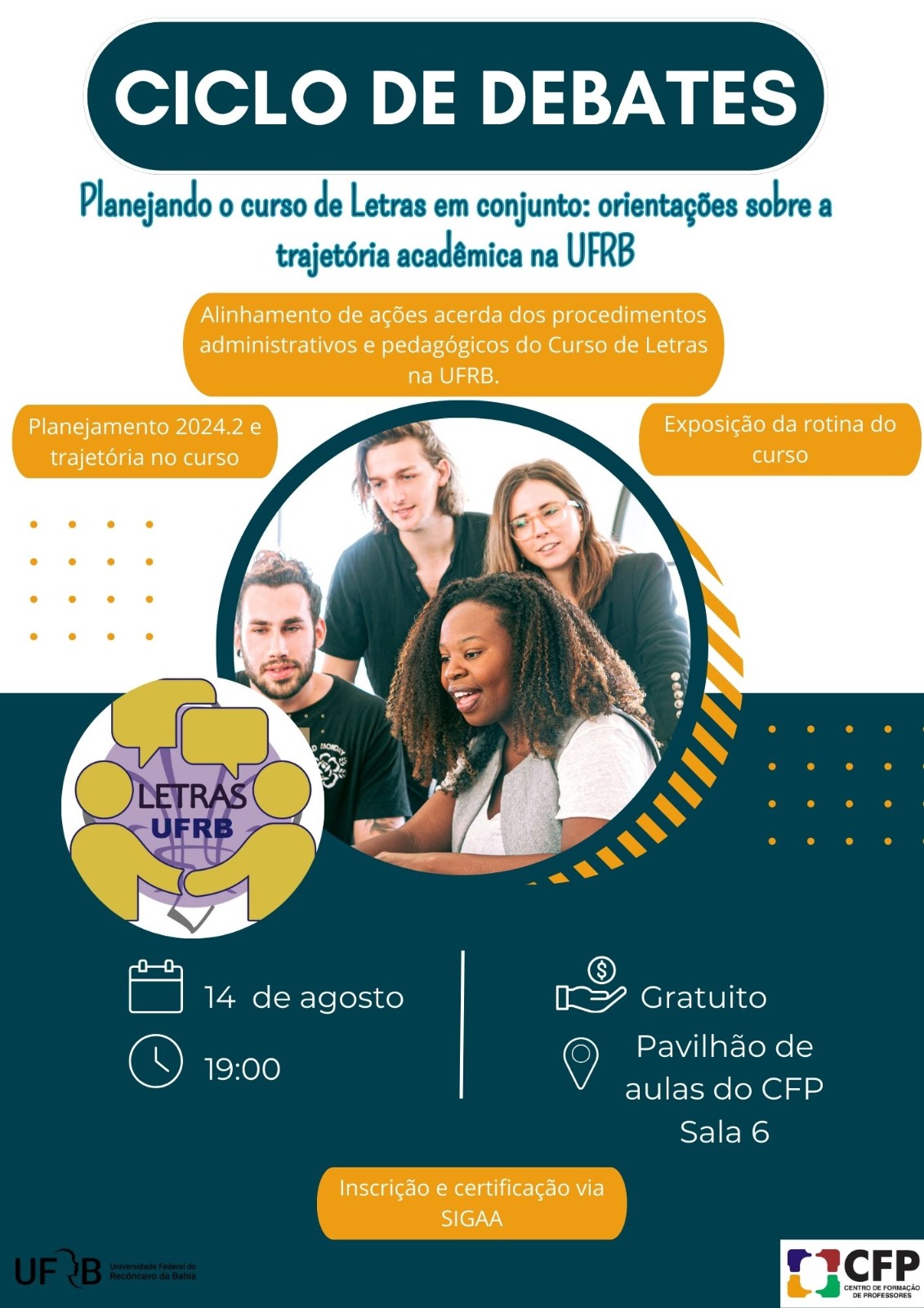 Evento voltado para o alinhamento de ações a serem realizadas quanto aos procedimentos administrativos e pedagógicos do Curso de Letras na UFRB. Através da exposição da rotina do curso e com o envolvimento dos alunos no processo de tomada de decisão relativo a sua própria trajetória acadêmica, este evento busca consolidar espaço de diálogo constante com o corpo discente, a fim de não só estreitar laços entre esses e a coordenação do curso, mas também orientar sobre a organização da carreira acadêmica em Letras, no que diz respeito ao planejamento de componentes curriculares, formas de avaliação e autoavaliação, e demais dimensões que impactam diretamente a vida estudantil.