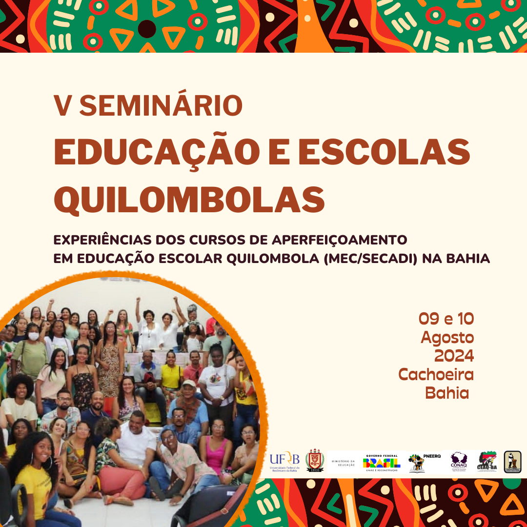 O V Seminário Educação e Escolas Quilombolas (UFRB), entre os dias 9 e 10 de agosto de 2024, em Cachoeira (Ba), reunirá professoras/es, lideranças, militantes, agentes do poder público e estudiosos/as para debater a educação escolar quilombola na Bahia, a partir das experiências dos Cursos de Aperfeiçoamento em Educação Escolar Quilombola, implementados, em 2023, como projeto-piloto da Diretoria de Políticas de Educação Étnico-racial e Educação Escolar Quilombola (MEC/SECADI).