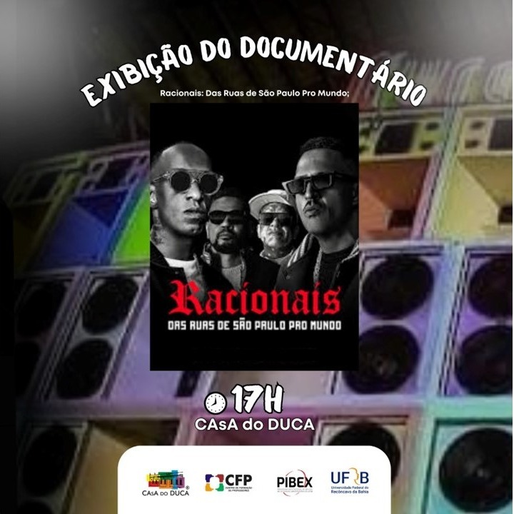 No dia 17 de Agosto, na CAsA do DUCA, os Cineclubes Cine Rapadura e Cine Aurora se juntam para exibir o documentário “Racionais – das ruas de São Paulo para o mundo”.A exibição pretende, além de homenagear esse que é um dos grandes grupos da vertente Rap do mundo, trazer questões tais como a influência do funk na identidade e cultura popular e seu papel como manifestação artística voltada à mobilização social e frequentemente associada a movimentos de empoderamento e conscientização coletiva.A cidade de Amargosa tem uma cena pulsante na linguagem do Rap e após a exibição do doc haverá Roda de conversa com os rappers da cidade: Billy Uprodutor, Broto Pai, Neuronêgo e com a estudante Beatriz Lacerda. A Roda será mediada por Saci, extensionista voluntário da CAsA do DUCA.Após a finalização da Roda terá início o Baile Furacão 2000, com uma seleção musical incrível organizada pelos extensionistas da CAsA do DUCA.Todo o evento foi pensado e organizado pelos estudantes Julia Midori (bolsista CAsA do DUCA e estudante de Letras), Jussara Bastos (bolsista CAsA do DUCA e estudante de Pedagogia), Edilana Barreto (extensionista voluntária CAsA do DUCA e estudante de Pedagogia), Zeca Paixão (bolsista Cine Rapadura e estudante de Pedagogia), Saci (extensionista voluntário CAsA do DUCA e estudante de Educação Física), Kassia Ellen (extensionista voluntária Cine Rapadura e estudante de Filosofia)O evento acontecerá dia dia 17/08 na CAsA do DUCA, localizada em frente à Praça do Cristo, centro de Amargosa.Exibição do documentário “Racionais – das ruas de São Paulo para o mundo” – 17hBaile Furacão 2000 – 21h