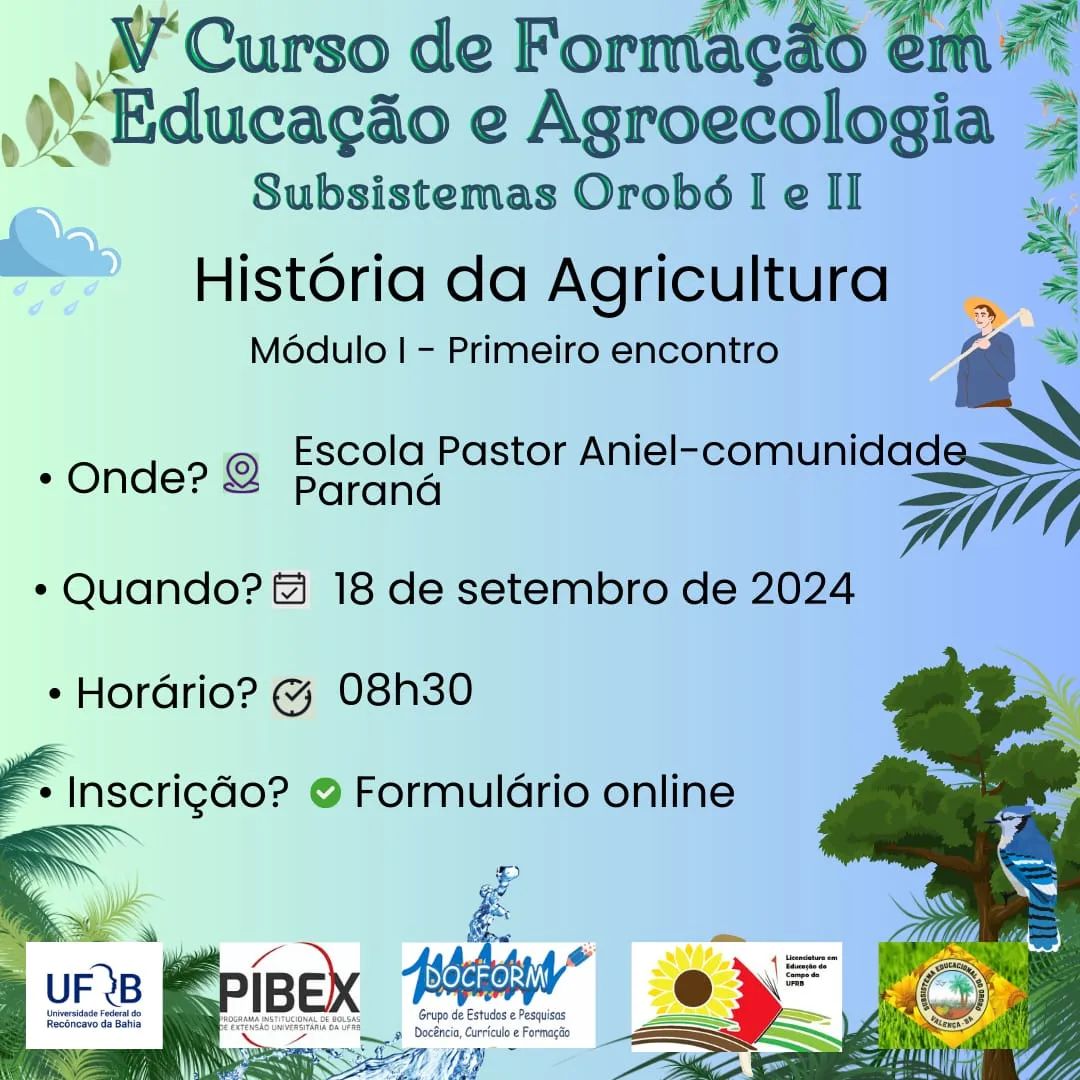 Olá, pessoal! O DOCFORM vem aí como mais uma edição do Curso de Formação em Educação e Agroecologia. A 5ª edição será realizada em Valença-BA, tendo como público alvo educadoras e educadores do Subsistema Educacional Orobó. Acompanhem em breve os nossos registros!