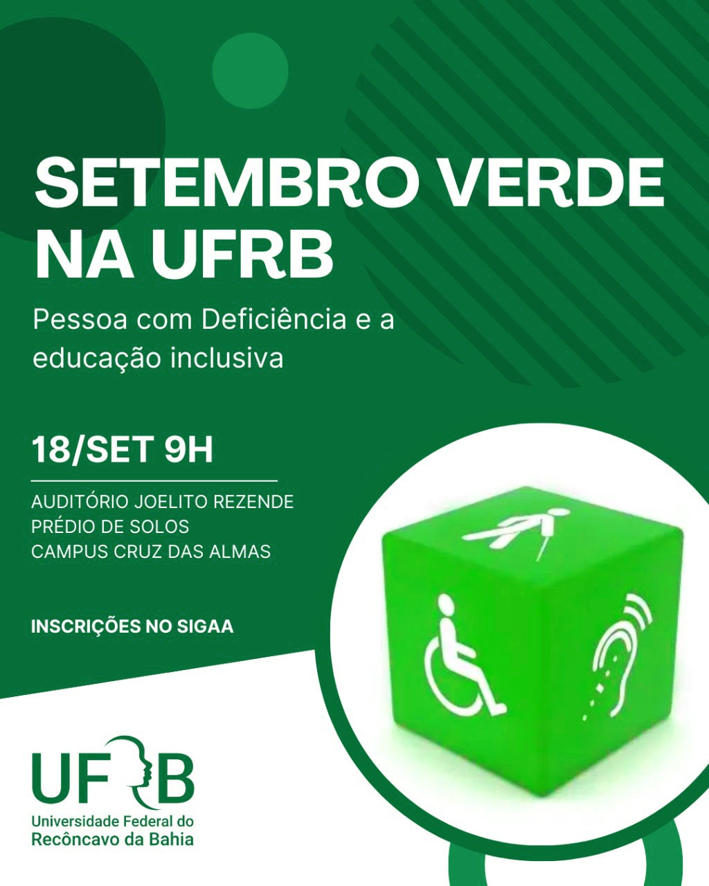 A UFRB, através da Pró-reitoria de Graduação, promove o evento "Setembro Verde na UFRB: Pessoa com Deficiência e a Educação Inclusiva", em comemoração ao setembro verde, mês dedicado à Pessoa com Deficiência e conscientização sobre a importância da inclusão.