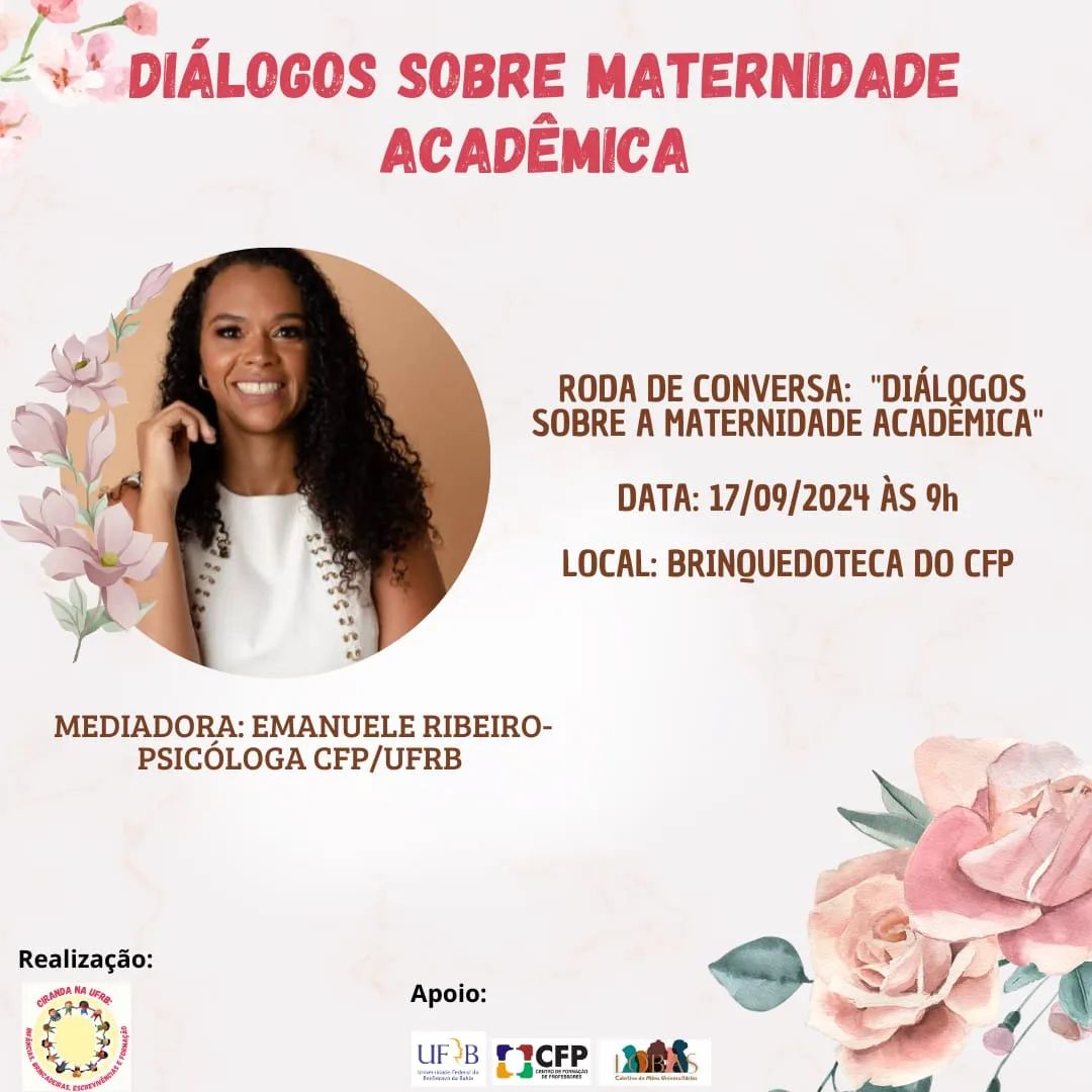 O Projeto de Extensão Ciranda na UFRB: infâncias, brincadeiras, escrevivências e formação e o Coletivo Lobas convidam para;Roda de conversa “Diálogos sobre maternidade acadêmica”, com a participação da Psicóloga Emanuele Ribeiro (Psicóloga do CFP/UFRB)? Data:17 de setembro⏰ Horário: 9h?Local: Brinquedoteca do CFP/UFRB
