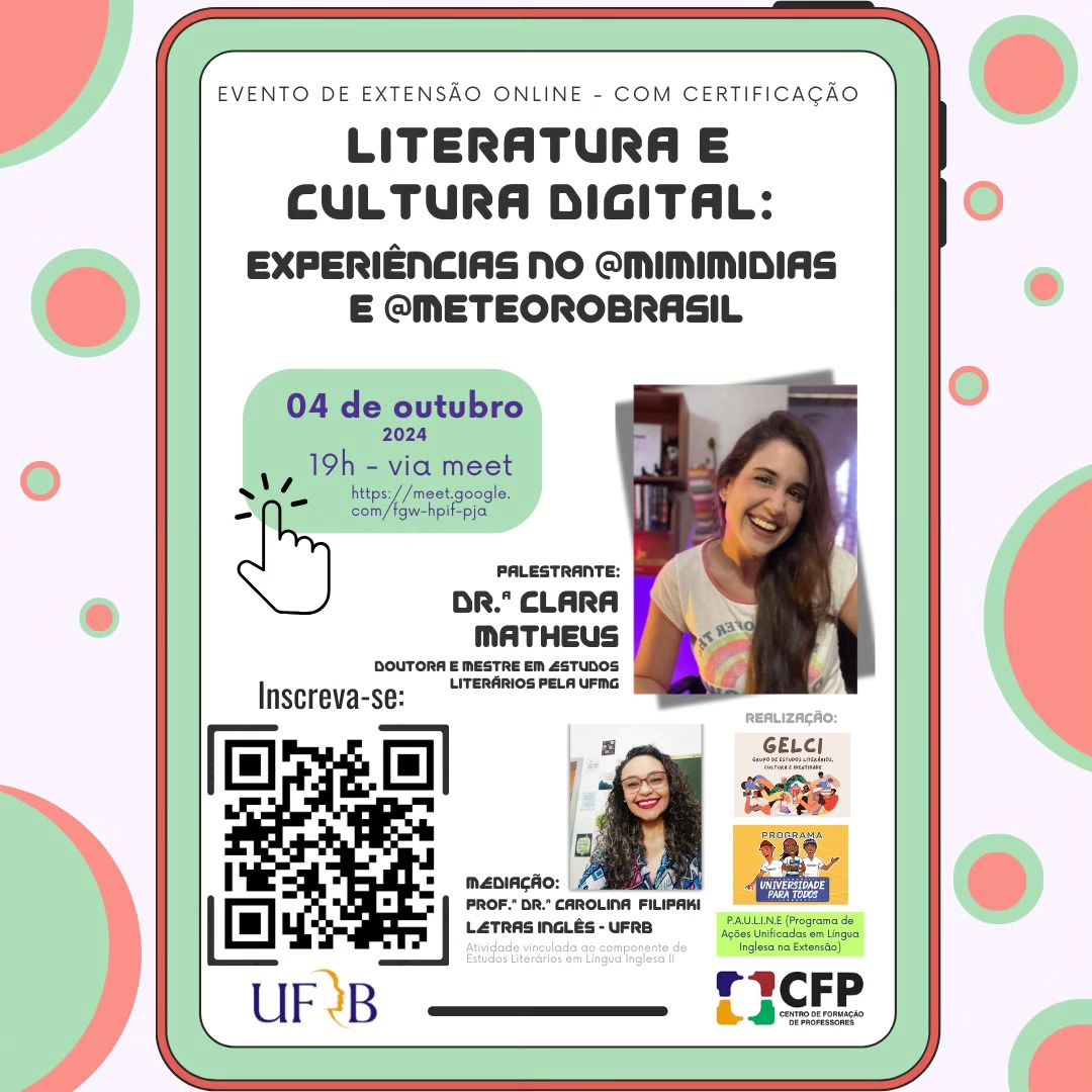 O evento Literatura e cultura digital: experiências no @mimimidias e @meteorobrasil, está vinculado ao componente de Estudos Literários em Língua Inglesa II, ofertado no semestre 2024.2, que prevê em sua ementa a abordagem de reflexões teórico-filosóficas atualizadas a respeito dos gêneros literários (em prosa e em verso) e seu desenvolvimento ao longo da história, bem como as releituras multiculturais de textos canônicos e não-canônicos das literaturas de língua inglesa, que contemplem parte da diversidade étnica, sexual, religiosa e outras presentes na formação das subjetividades das culturas anglófonas.