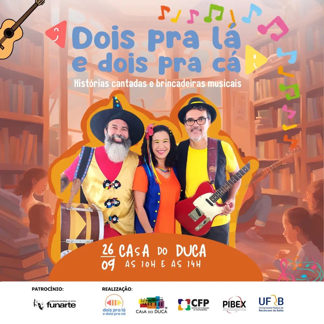? Dois pra lá e dois pra cá - Histórias Cantadas e Brincadeiras Musicais ?⠀Venha viver uma experiência única de música, contação de histórias e brincadeiras interativas na CAsA do DUCA, no dia 26 de setembro, com sessões às 10h e 14h! ??⠀Inspirado no livro de Jamile Menezes, "As escolas de Joana", o show traz cantigas populares e histórias que despertam a imaginação, mostrando que a aprendizagem está por todo lado – na família, nos amigos e no caminho para a escola.Traga as crianças e se divirta com muita música, guitarra, percussão e vozes que envolvem o público em uma viagem de cultura e diversão! ?????“Dois pra lá e dois pra cá” é formado Jamile Menezes, Nuno Menezes e Petry Lordelo, um grupo de amigos com mais de 15 anos de experiência em Música, Educação e Arte que acredita na música e na ludicidade como ferramentas de transformação, alegria e partilha. Além de artistas, também atuam como professores da educação básica. ✨?⠀?️ Data: 26 de Setembro? Horário: 10h e 14h? CAsA do DUCA ?Não perca essa oportunidade de brincar, cantar e aprender com a gente!!Patrocínio: @funarte