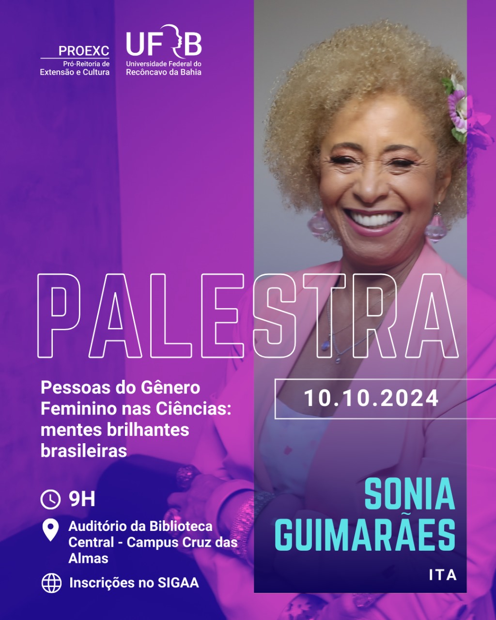 A Universidade Federal do Recôncavo da Bahia (UFRB) receberá a professora Sônia Guimarães, do Instituto Tecnológico de Aeronáutica (ITA), para uma palestra no dia 10 de outubro, às 9h, no auditório da Biblioteca Central do Campus Cruz das Almas. O evento faz parte do programa de extensão "Mulheres na Ciência: mentes brilhantes no Recôncavo da Bahia", coordenado pela professora Rogelma Ferreira, do Centro de Ciências Exatas e Tecnológicas (CETEC). O programa tem como objetivo promover uma ciência mais diversa e representativa em termos de gênero.