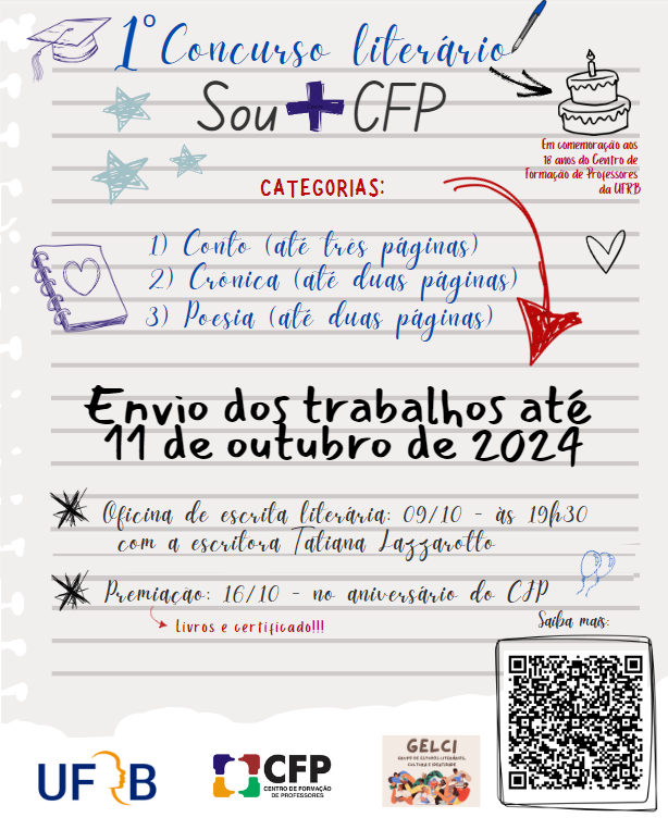 A história do Centro de Formação de Professores é repleta de narrativas pessoais que moldam o CFP e marcam a vida daqueles que fazem ou fizeram parte dele. Desta forma, instiga-se o registro de tais narrativas, que resulta na construção coletiva da memória da instituição. A realização do concurso literário para comemorar o aniversário do CFP representa uma forma enriquecedora de celebrar a trajetória e os valores da universidade, ao mesmo tempo em que promove a expressão criativa e o engajamento da comunidade acadêmica. A literatura, como forma de arte e reflexão, oferece um meio poderoso para que alunos, professores, servidores e membros da comunidade se conectem com a história e a identidade da instituição, explorando temas relevantes e pessoais que se entrecruzam com a experiência universitária. O 1º Concurso literário: Sou + CFP aceitará trabalhos nas categorias conto, crônica e poesia, com a temática “Centro de Formação de Professores da UFRB” a fim de celebrar os 18 anos de existência do CFP, comemorados no dia 16 de outubro de 2024. O concurso é aberto a toda a comunidade acadêmica, bem como à comunidade externa.