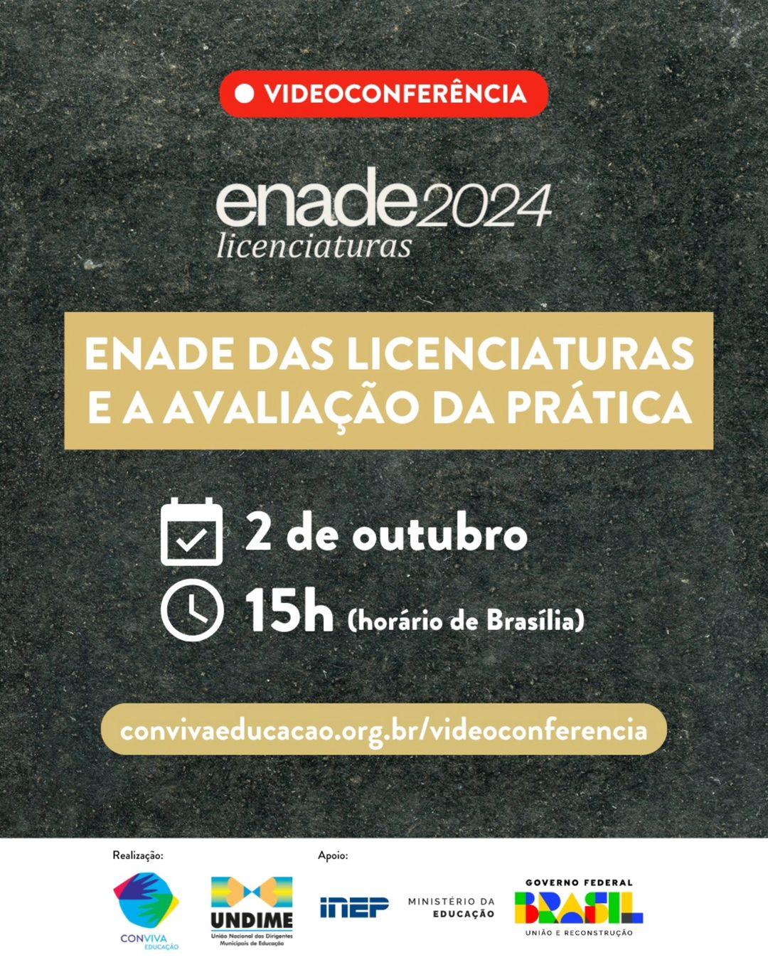 Atenção estudantes dos cursos das áreas de licenciatura avaliadas no Enade 2024 ⚠️O Enade foi reformulado para aperfeiçoar a avaliação dos cursos que formam professores no Brasil. Além das provas teóricas, já comumente realizadas, o exame contará com uma avaliação da prática dos estudantes de graduações direcionadas à docência. A Avaliação da Prática consiste em avaliar as competências práticas do estudante de licenciatura, por meio da avaliação de uma aula e de seu respectivo plano de aula. Ela será aplicada durante a realização dos estágios supervisionados obrigatórios em escolas de educação básica, públicas ou privadas. O procedimento será realizado no período em que o estudante de licenciatura assume a regência de classe. O supervisor deste estágio obrigatório atuará como avaliador externo do Inep no âmbito da Avaliação da Prática.Para conversar sobre o Enade das Licenciaturas e a Avaliação da Prática, a Undime promoverá, com apoio do Inep, videoconferência no dia 2 de outubro, quarta-feira, às 15h (horário de Brasília). A transmissão será ao vivo pelo Conviva Educação.Para participar não é necessário realizar inscrição, basta acessar convivaeducacao.org.br/videoconferenciaA transmissão é aberta ao público!Assista ao vivo e garanta sua declaração de participação ao preencher a lista de presença.