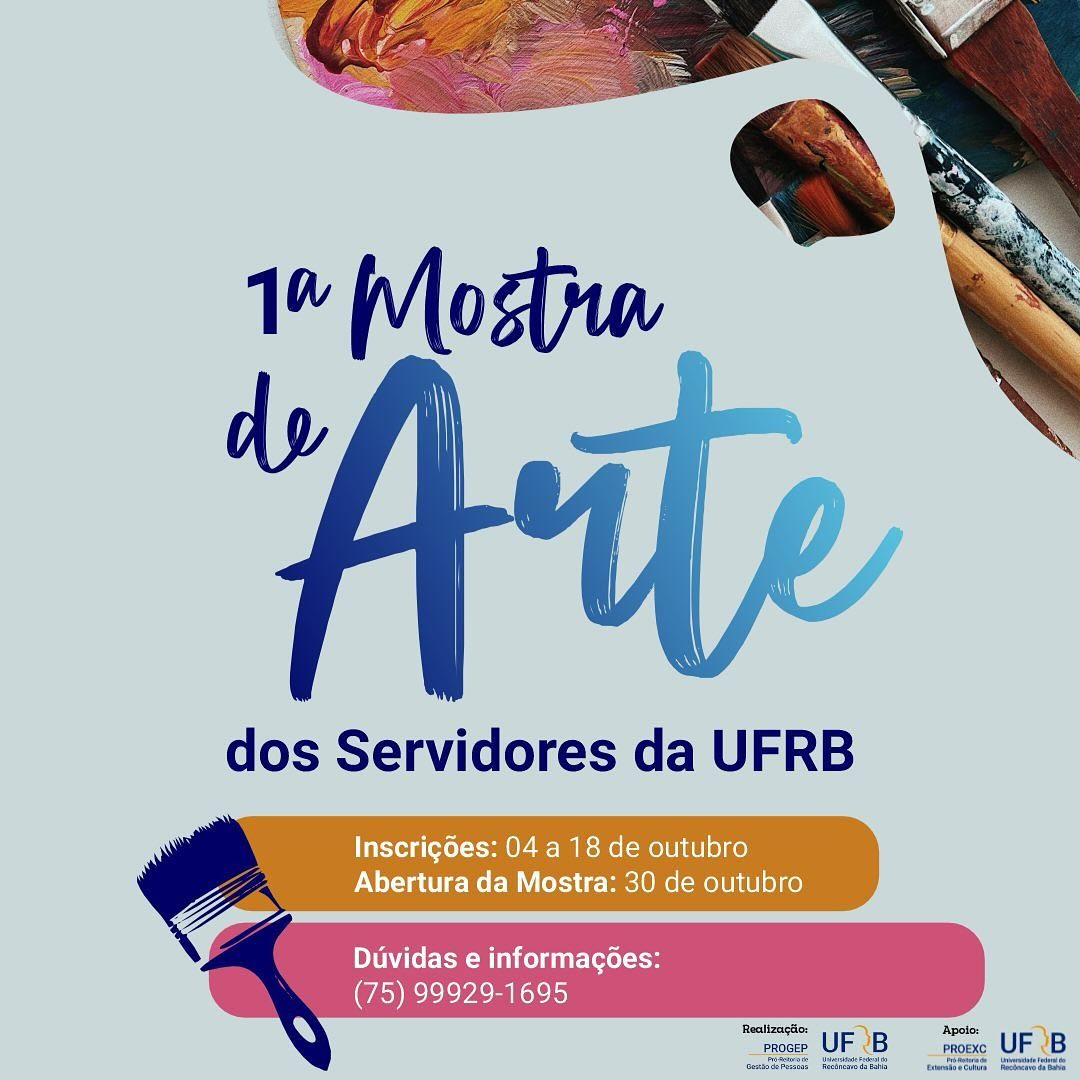 A 1ª Mostra de Artes dos(as) Servidores(as) da UFRB, tem por objetivo apresentar à comunidade as contribuições artísticas daqueles que já contribuem com a manutenção e aprimoramento desta Universidade Pública, sejam servidores(as) técnicos(as), docentes ou funcionários(as) terceirizados(as) que prestam serviço nas dependências da universidade.
