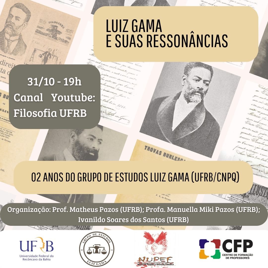 Evento que conta com o Prof. Matheus Pazos (Filosofia UFRB/NUPEF) como um dos organizadores."Luiz Gama e suas ressonâncias": 02 anos do Grupo de Estudos Luiz Gama (UFRB/CNPq) - @grupodeestudosluizgama31/10 - 19hCanal do Youtube: Filosofia UFRBSobre os professores convidados:Ronald Augusto é poeta, ensaísta, crítico de poesia e professor de Filosofia. Licenciado em Filosofia (UFRGS). Mestre em Letras: Teoria, Crítica e Comparatismo (UFRGS). Doutorando em Letras (UFRGS) na mesma área de pesquisa. É autor de, entre outros, Homem ao Rubro (1983), Puya (1987), Kânhamo (1987), Vá de Valha (1992), Confissões Aplicadas (2004), No Assoalho Duro (2007), Cais de Costas (2012), Oliveira Silveira: poesia reunida (2012), Decupagens Assim (2012), A Contragosto do Solo (2020), O Leitor Desobediente (2020), Crítica Parcial (2022) e E mais não digo (2023).Fernando Tisque possui Doutorado (2015) e Mestrado (2010) em Educação pela Universidade de São Paulo (USP) na linha de pesquisa de História da Educação e Historiografia. Graduado em Licenciatura em História pela Universidade Estadual de Ponta Grossa (UEPG). Atualmente é professor adjunto no Centro de Formação de Professores (CFP) da Universidade Federal do Recôncavo da Bahia (UFRB). É coordenador do projeto de pesquisa "Ensinar e Aprender História nas séries iniciais: formação de professores, currículos e práticas escolares na região do Vale do Jiquiriçá (BA)". Desde 2023 é Vice-Diretor e Assessor de Direção do CFP/UFRB.Túlio Henrique Pereira possui Pós-Doutorado em História do Brasil pelo Programa de Pós-Graduação em História do Brasil da Universidade Federal do Piauí (PPGHB/UFPI). Doutorado em História Social no Programa de História Social da Universidade Federal de Uberlândia (PPGHI/UFU). É professor Adjunto do Departamento de História da Universidade Regional do Cariri (URCA), e professor permanente do Programa de Pós-Graduação ProfHistória da URCA. Líder do GEPAFRO – Grupo de Estudo e Pesquisa em História Afrodiaspórica.