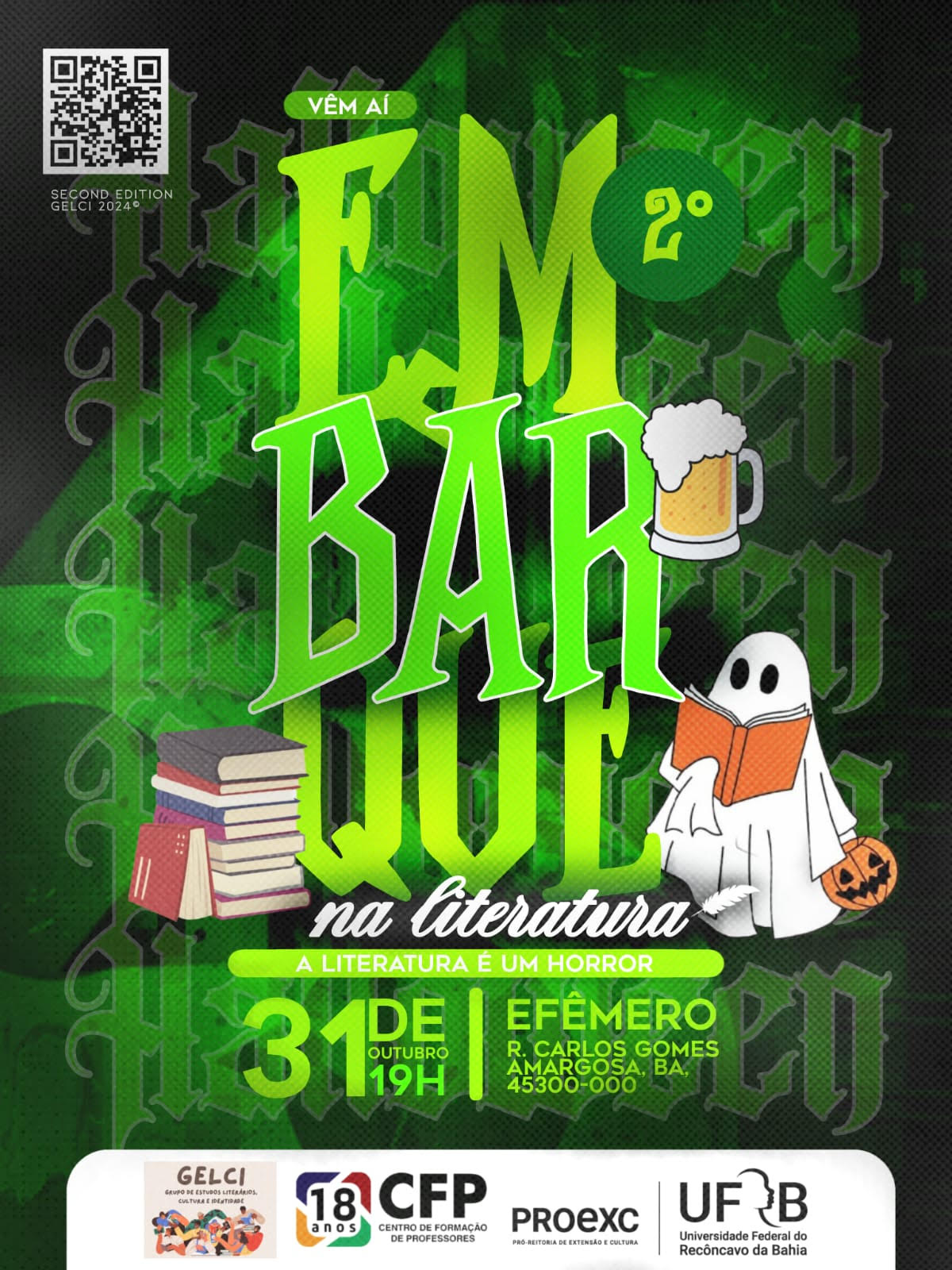 O Grupo de Estudos Literários, Cultura e Identidade (GELCI), do curso de Letras Inglês da UFRB, tem o prazer de convidar toda a comunidade acadêmica para a segunda edição do evento EmBARque na Literatura: A literatura é um horror - Especial de Halloween.