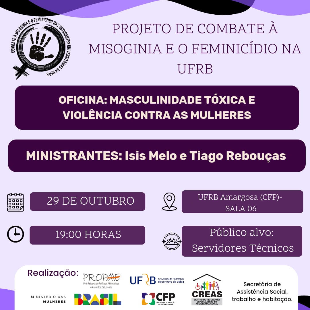 Essa oficina acontece como uma parceria entre o nosso projeto e o CREAS de Amargosa. O projeto intitulado “Combate à Misoginia e ao Feminicídio para Estudantes Universitárias da UFRB” no Centro de Formação de Professores. O projeto é uma ação institucional desenvolvida em parceria entre a Universidade Federal do Recôncavo da Bahia e o Ministério das Mulheres cujas atividades visam à ampliação do acesso e permanência de mulheres negras na universidade.