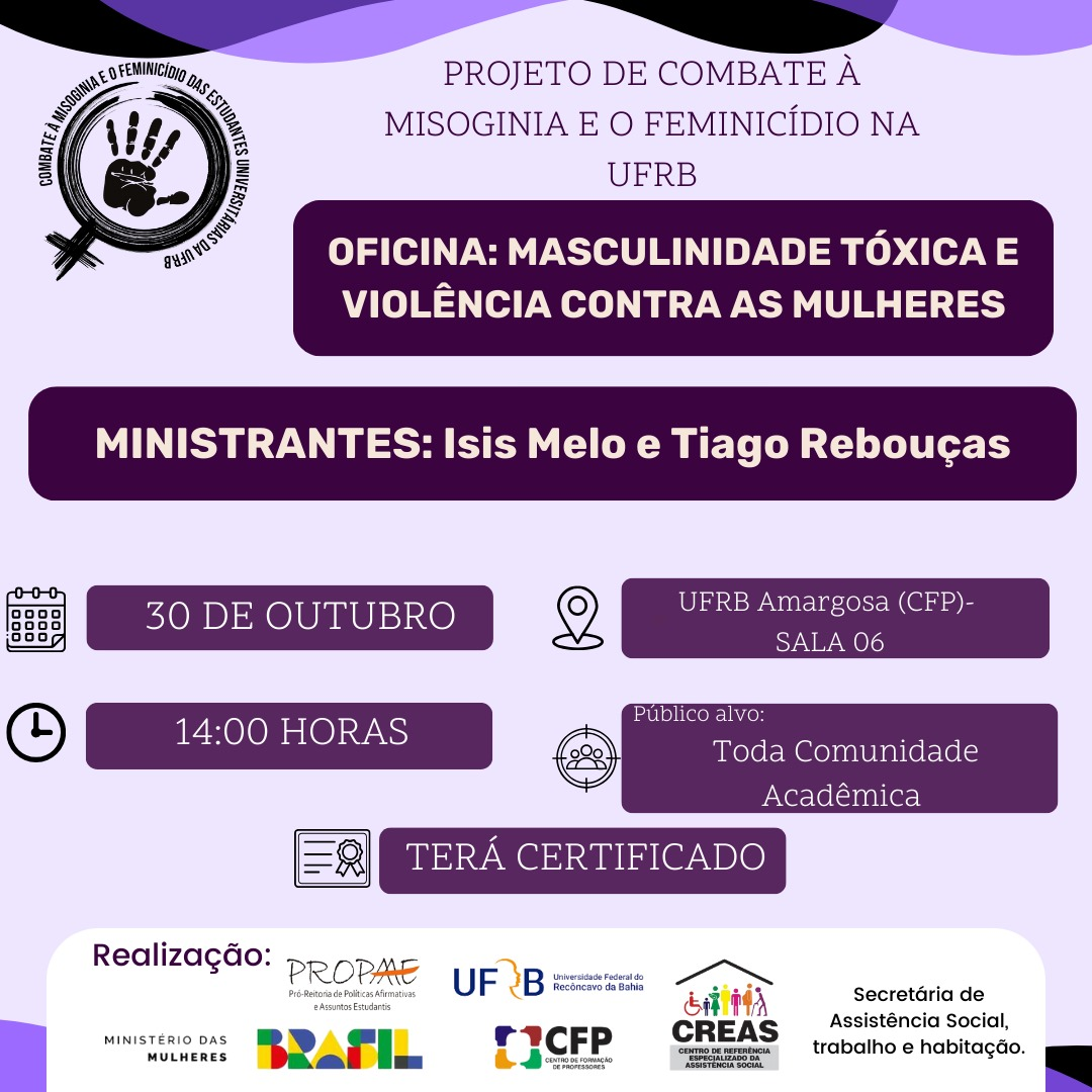 Convidamos toda a comunidade Acadêmica para uma oficina em que debateremos as situações que envolvem masculinidade tóxica e violência contra as mulheres.