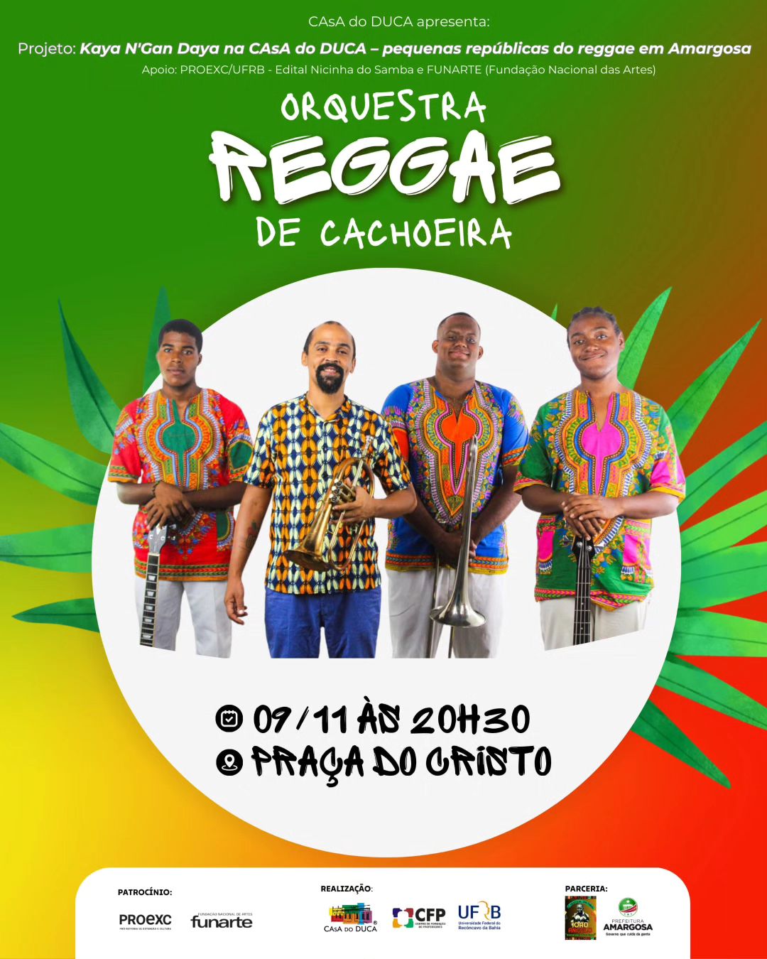 Sábado, 09/11/2024, a Praça do Cristo vai tremer com a Orquestra Reggae de Cachoeira!!!A Orquestra é uma das atrações do Projeto “Kaya N'Gan Daya na CAsA do DUCA – pequenas repúblicas do reggae em Amargosa”, que tem apoio da PROEXC/UFRB (por meio do Edital Nicinha do Samba) e da FUNARTE (por meio do Projeto Artes e Culturas na CAsA do DUCA – Educar para um mundo igualitário, sensível e belo).O Show também compõe a programação do Festival João Angelo @fcjoaoangeloamargosa2024 (numa parceria CAsA do DUCA e Festival), que tem coordenação geral de Led Beslard @vegantropico e apoio da Prefeitura de Amargosa!Sábado é dia Kayr n´gan daya!