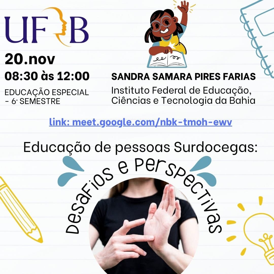 No dia 20 de novembro de 2024, será realizado um evento especial sobre Educação Especial, vinculado ao componente curricular GCFP294, ministrado pela professora Thereza Bastos. A atividade acontecerá no período da manhã, por meio da plataforma Google Meet.
