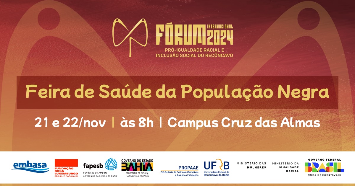 Nos dias 21 e 22 de novembro, às 8h, como parte da programação do Fórum Internacional Pró-Igualdade Racial e Inclusão Social do Recôncavo (Fórum 2024), a Universidade Federal do Recôncavo da Bahia (UFRB) realizará a Feira de Saúde da População Negra, uma iniciativa dedicada à oferta de serviços de saúde gratuitos e acessíveis. O evento conta com a colaboração do projeto Saúde Mais Perto (Orgulho Negro), em parceria com a Secretaria da Saúde do Estado da Bahia (SESAB), a Secretaria Municipal de Saúde de Cruz das Almas, a Fiocruz Bahia, o Instituto Educacional Edward Jenner (IEEJ), o Instituto de Cardiologia do Recôncavo (INCAR) e a Cardioimagem. A feira é aberta a toda a população, especialmente aqueles que necessitam de exames e cuidados específicos.