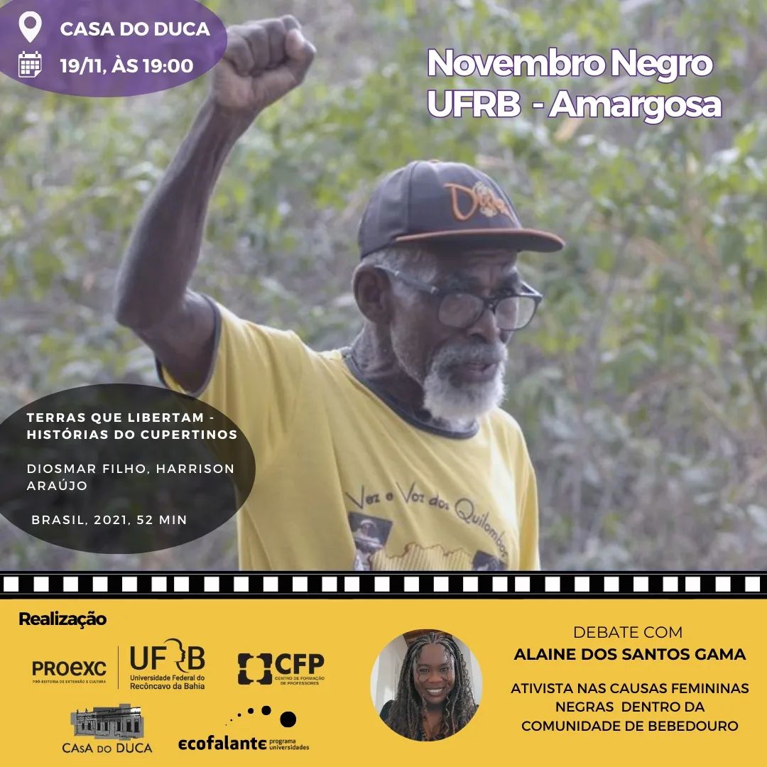 Cine Rapadura e Cine Aurora realizam no dia 19 de novembro de 2024 uma programação especial do Programa Ecofalante Universidades, extensão educacional da Mostra Ecofalante de Cinema, um dos maiores festivais do Brasil e o mais importante evento audiovisual sul-americano dedicado a temas socioambientais.A exibição será com o documentário *Terras que Libertam*, de Diosmar Filho e Harrisson Araújo, compondo a programação do Novembro Negro em Amargosa, Bahia.Essa é uma realização do Centro de Formação de Professores e da Proexc, fruto da parceria entre a UFRB e a Ecofalante. Não perca a oportunidade de refletir sobre as questões sociais e ambientais que impactam nossas comunidades!Caso seja da região e queira participar, a sessão é aberta, se inscreva pelo link: https://sistemas.ufrb.edu.br/sigaa/public/servicos_digitais/extensao/login.jsf