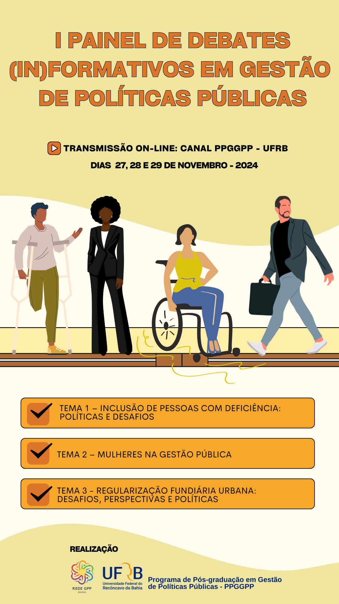O evento será realizado nos dias 27 e 28 de novembro de e dia 03 de dezembro de 2024, com transmissão ao vivo pelo canal do Mestrado em Gestão de Políticas Públicas (PPGGPP) no YouTube, sempre às 19h, e contará com debates de 1 hora de duração. Cada dia abordará um tema específico, mediado por discentes do programa e com a participação de convidados especialistas.