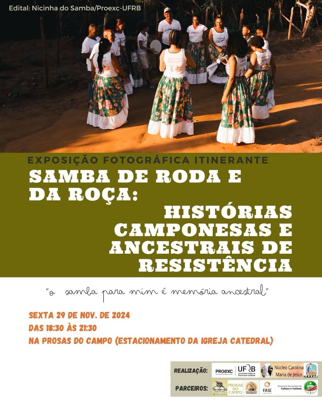 “Samba de Roda e da Roça: Histórias Camponesas e Ancestrais de Resistência” é o tema da exposição fotográfica itinerante que acontecerá amanhã, a partir das 18:30, na Prosas do Campo, no estacionamento da Igreja Matriz, Amargosa, Ba.A exposição é uma das atividades vinculadas ao Projeto de Extensão “Fortalecimento do Samba de Roda da comunidade Tamanduá: Formação audiovisual e produção foto-narrativas - ancestralidade, cultura camponesa e diálogo de saberes”.O projeto é vinculado ao Núcleo Carolina Maria de Jesus CFP/UFRB, Programa de Extensão TECELENDO e Associação da comunidade Tamanduá e tem como objetivo principal o fortalecimento do Samba de Roda da comunidade Tamanduá por meio da produção audiovisual e do diálogo com a ancestralidade, a cultura camponesa e os processos culturais de resistência.A proposta faz parte do Edital de apoio a Programas e Projetos de Extensão em Arte e Cultura - Nicinha do Samba - PROEXC/UFRB.