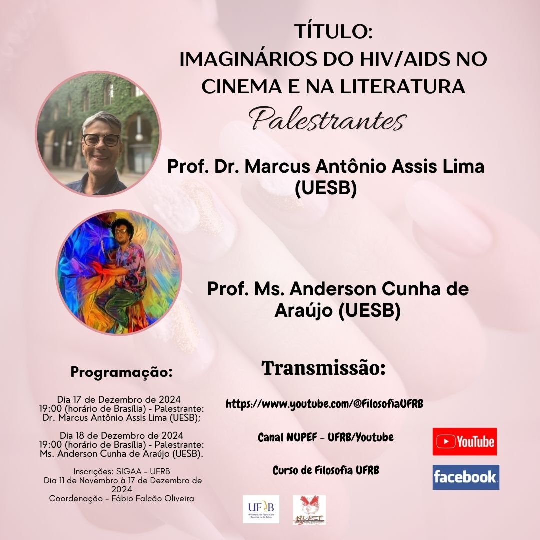 A palestra terá como finalidade o tema IMAGINÁRIOS DO HIV/AIDS NO CINEMA E NA LITERATURA e contará com o Prof. Dr. Marcus Antônio Assis Lima (UESB) e Prof. Ms. Anderson Cunha de Araújo (UESB) que tratará sobre os imaginários e estereótipos acerca HIV/AIDS no cinema e na literatura. Para tanto, apresentaremos um mapeamento e resgate de obras cuja temática busca retratar pessoas que vivem com o vírus HIV e como elas são representadas em algumas obras. Em relação ao cinema, resgatamos produções estadunidenses dos anos 1980 e 1990, muitas das quais não foram lançadas no Brasil. No caso da literatura, poucas obras foram produzidas e publicadas, especialmente nos anos 1990; são obras autobiográficas, autoficcionais, ficcionais ou ensaios de autores como Jean-Claude Bernardet, Herbert Viana, Caio Fernando de Abreu entre outros. De imediato, pode-se perceber uma relevante sequência de mudanças no perfil sociológico dos protagonistas das tramas fílmicas bem como as transformações narrativas acerca das dificuldades de tratamento e da luta dos movimentos sociais organizados LGBTS. Na literatura, as pessoas que vivem com HIV/AIDS são retratadas, prioritariamente, como párias da sociedade, fadados a uma morte civil antes da morte propriamente dita.