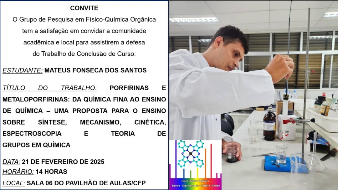 O grupo de Pesquisa em Físico-Química Orgânica tem a satisfação em convidar a comunidade acadêmica e local para assistirem a defesa do Trabalho de Conclusão de Curso:
