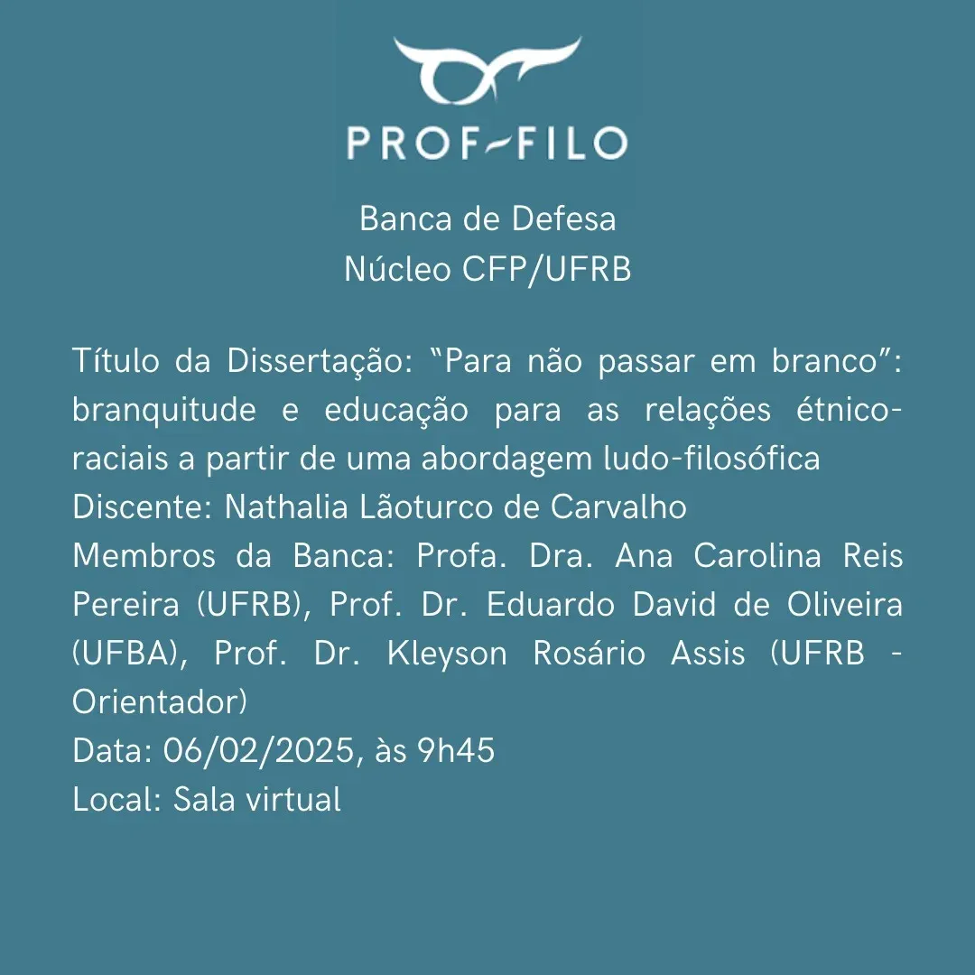 Defesa de Dissertação: “Para não passar em branco”: branquitude e educação para as relações étnico-raciais a partir de uma abordagem ludo-filosófica