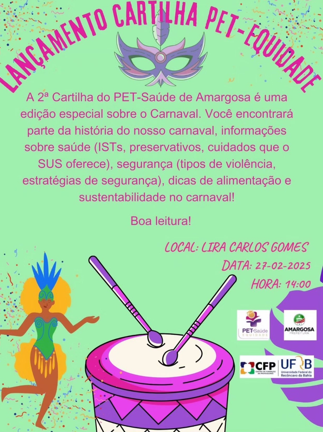 O PET-Saúde de Amargosa apresenta a 2ª Cartilha PET-Equidade, uma edição especial dedicada ao Carnaval. O material traz informações sobre a história do Carnaval, saúde (prevenção de ISTs, uso de preservativos e serviços oferecidos pelo SUS), segurança (tipos de violência e estratégias de proteção), além de dicas de alimentação e sustentabilidade durante a festa.