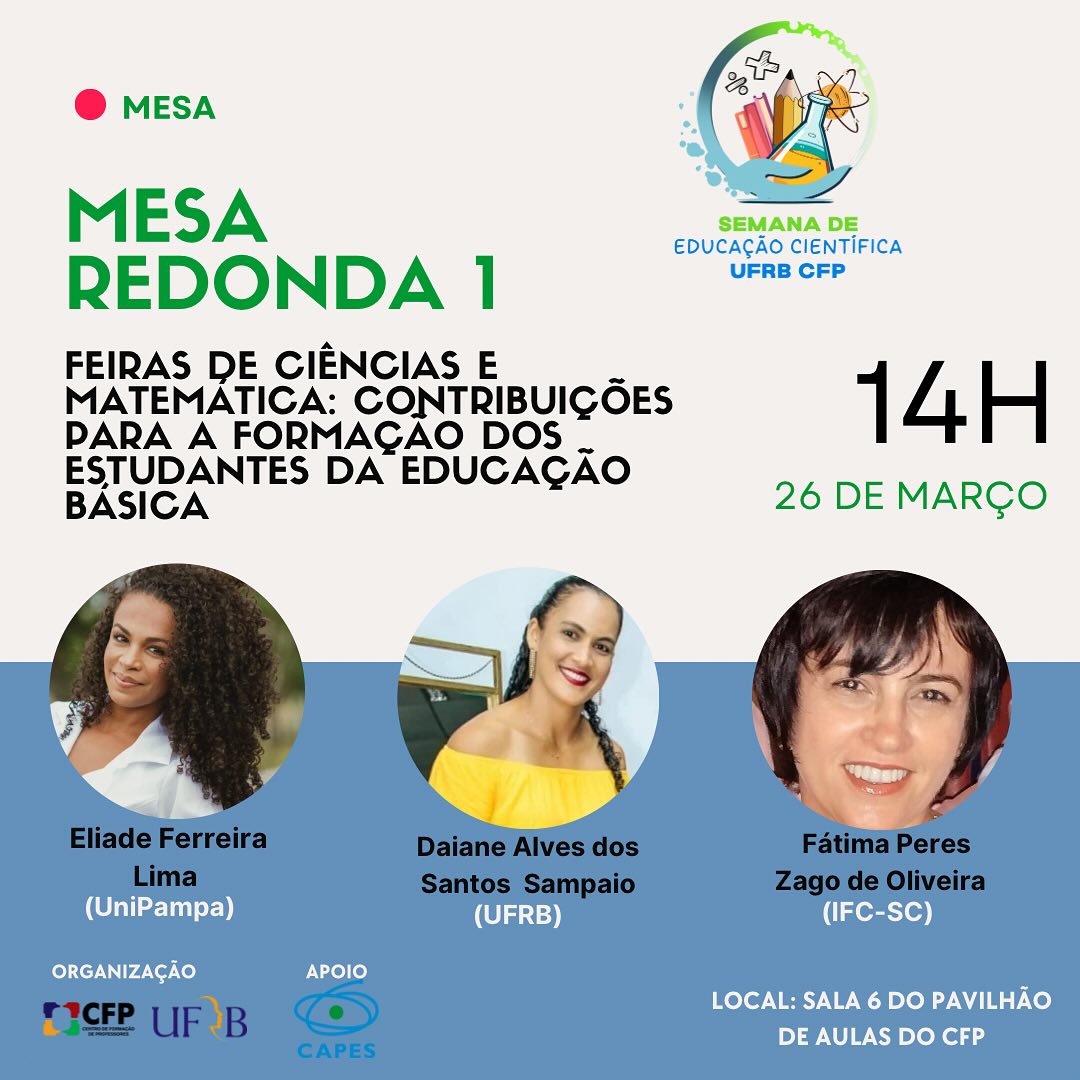 ? Participe da Mesa Redonda: "Feiras de Ciências e Matemática: contribuições para a formação dos estudantes da Educação Básica" ?? Data: 26/03/2025? Horário: 14:00 - 16:30? Local: Sala 6, Pavilhão de Aulas do CFP? Convidados:Daiane Alves dos Santos Sampaio (UFRB)Eliade Ferreira Lima (UniPampa)Fátima Peres Zago de Oliveira (IFC-SC)Venha discutir o impacto das Feiras de Ciências e Matemática na formação dos estudantes da Educação Básica e as novas perspectivas para o ensino!